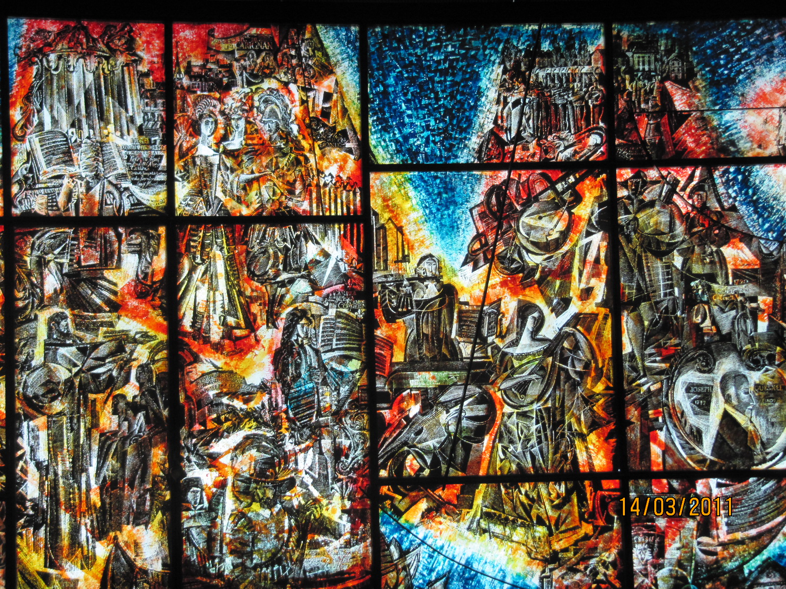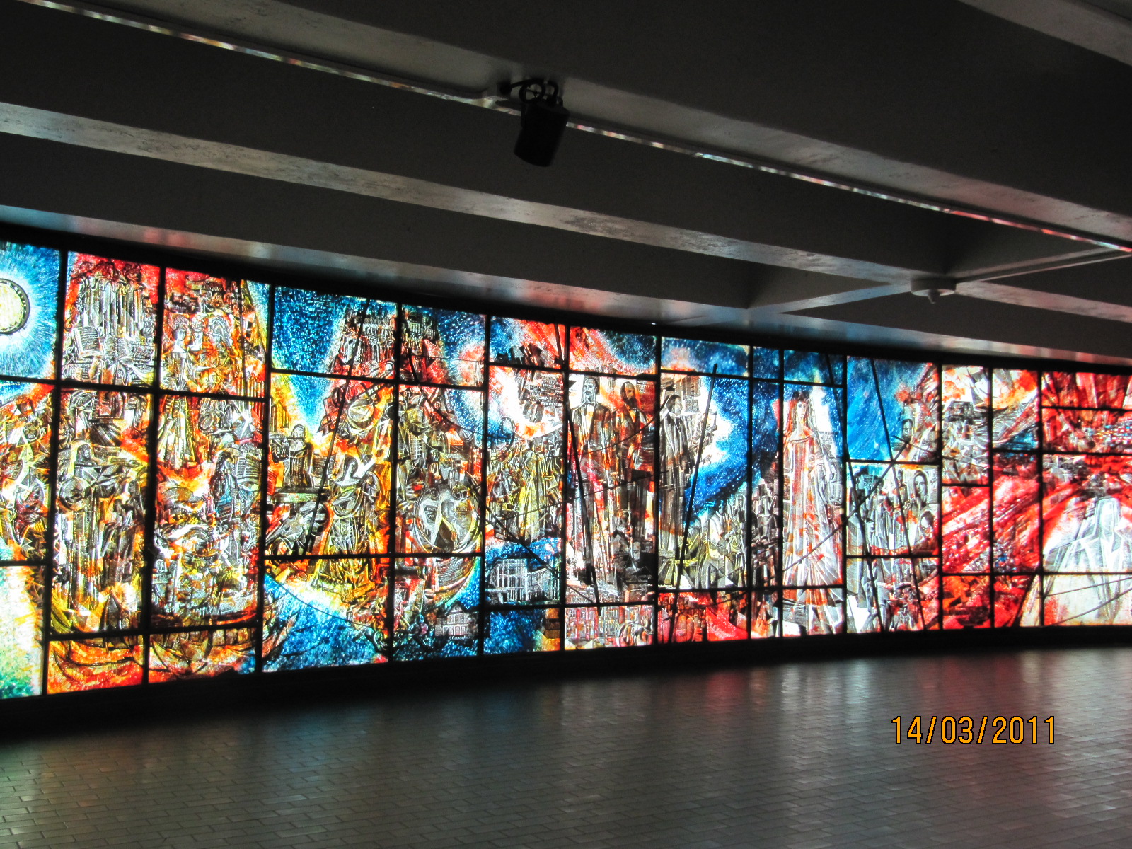 Revenant par le métro, j'ai pris ce vitrail en verre et fer à la station Place-des-Arts intitulé «Les Arts lyriques» de Fréderic Back