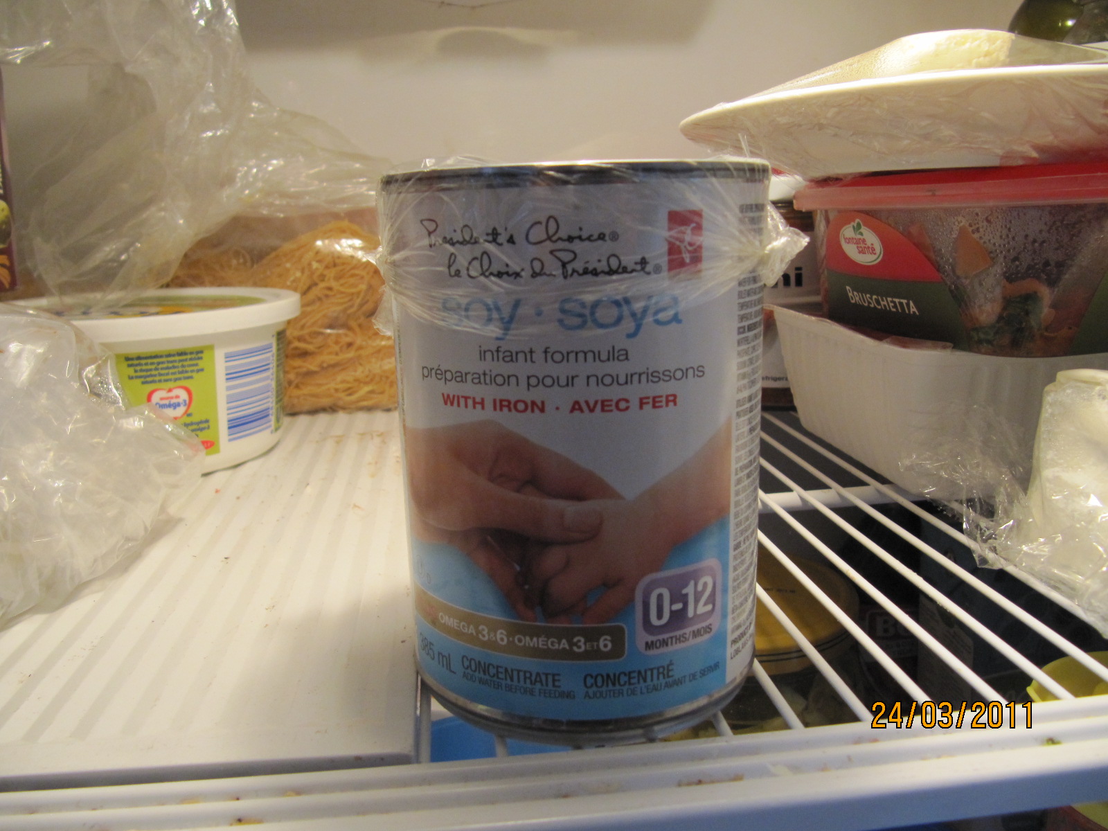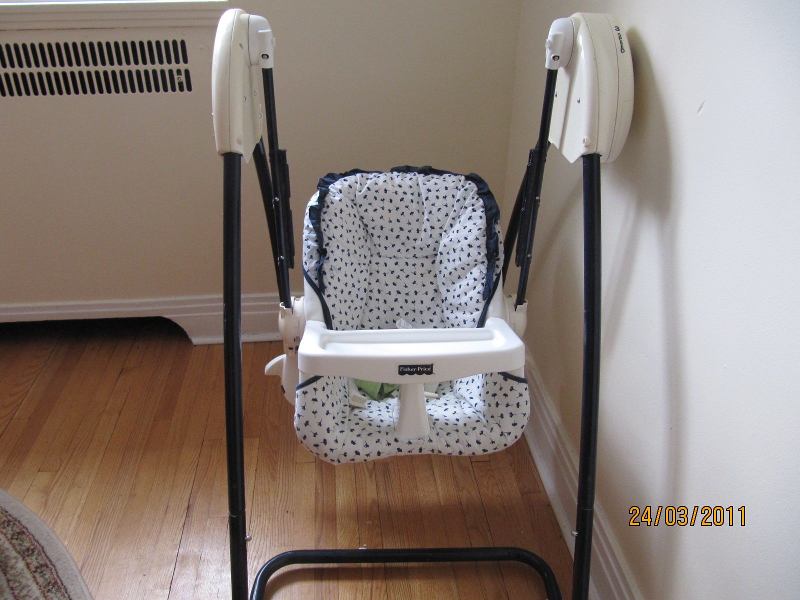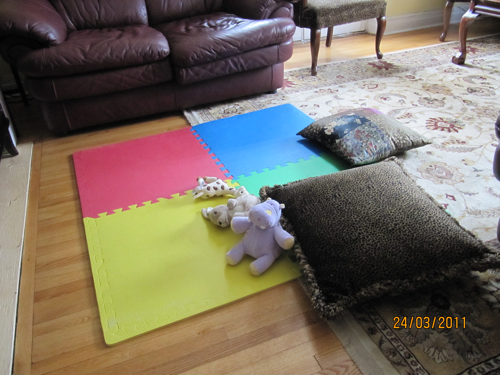 Son tapis de jeux et ses toutous dans le salon, sa chaise berçante dans la salle à manger et son lait dans mon frigo