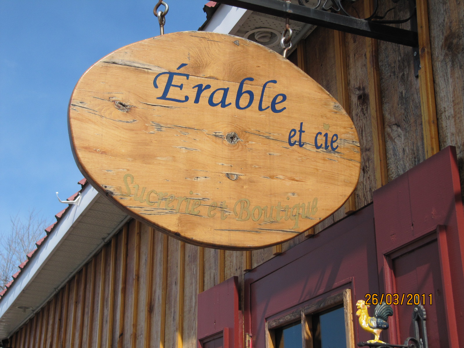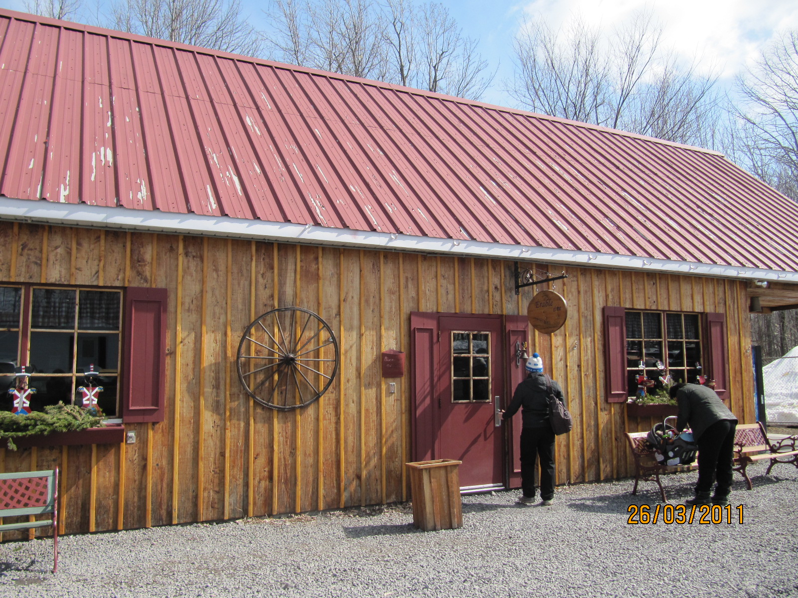 Aujourd'hui, sortie à la cabane à sucre avec nos enfants. Rien de bien original puisque c'est LA fin de semaine la plus achalandée pour les cabanes à sucre. Temps beau et froid. À sept, sans compter la petite, nous étions serrés à une petite table coincée dès la porte d'entrée de la grande salle à manger. Repas traditionnel. Les garçons sont en grande forme. La petite est passée de bras en bras. Occasion pour prendre plusieurs photos en famille. Mais la tablée n'est pas très plaisante pour être immortalisée ...