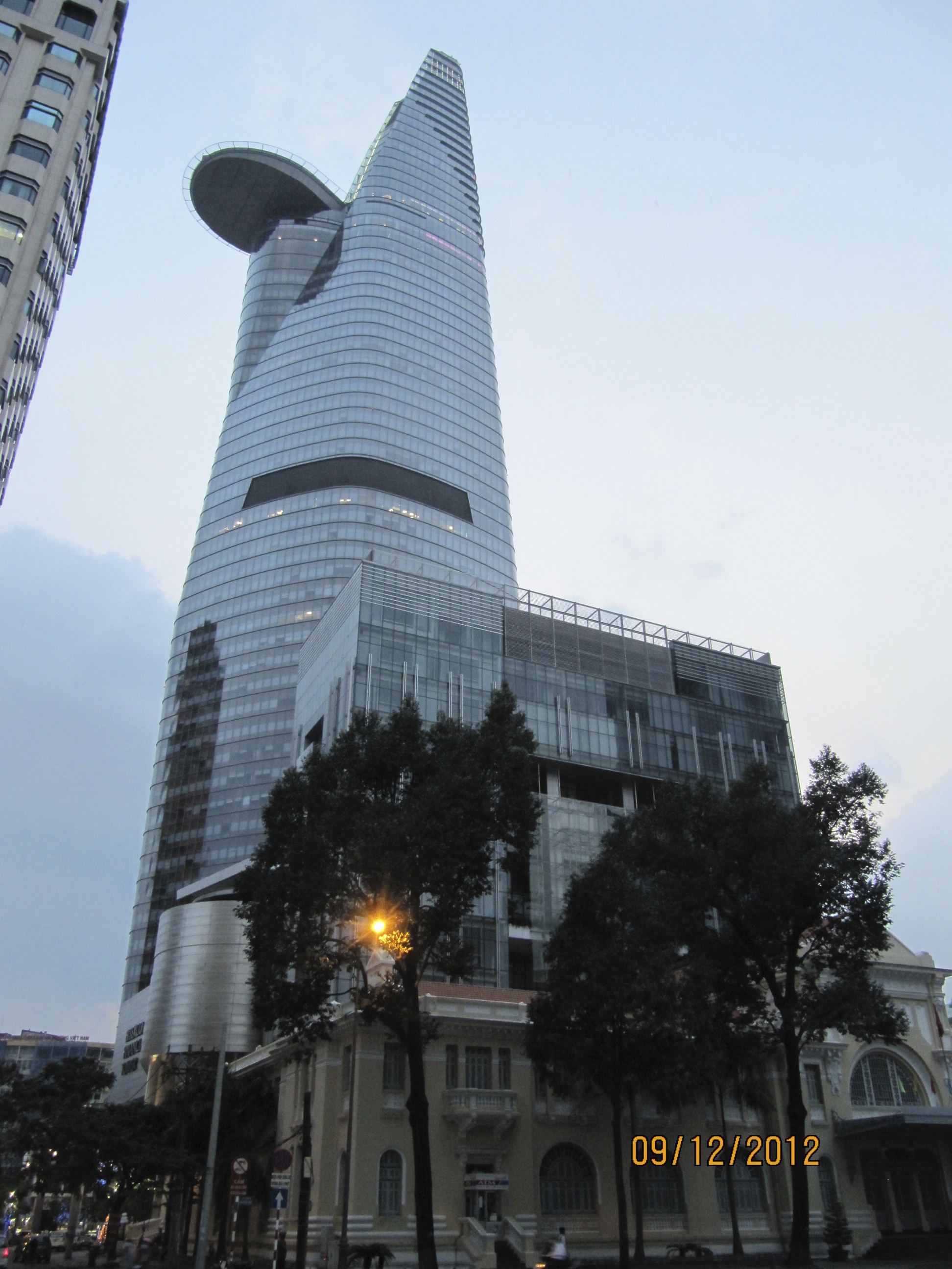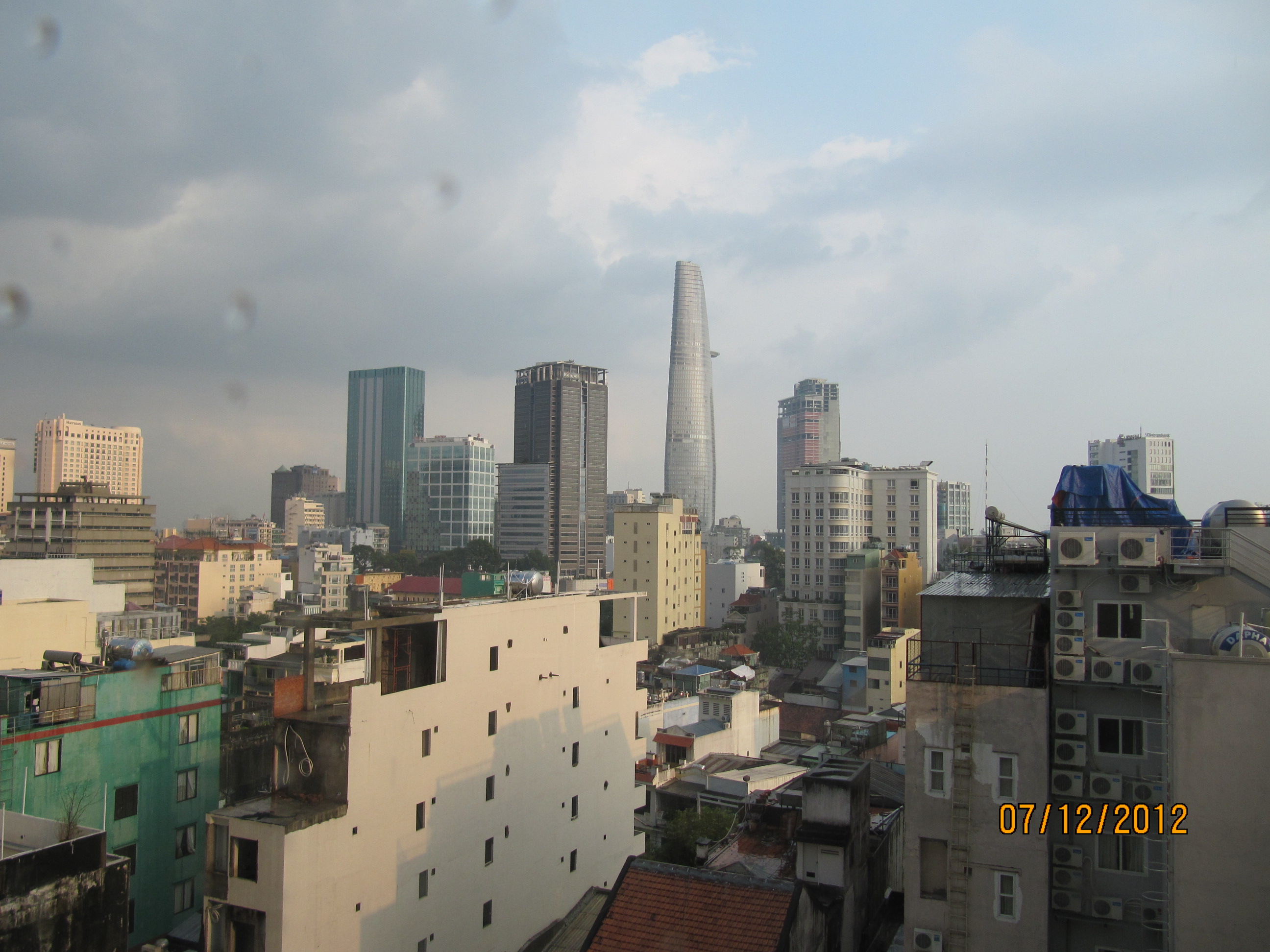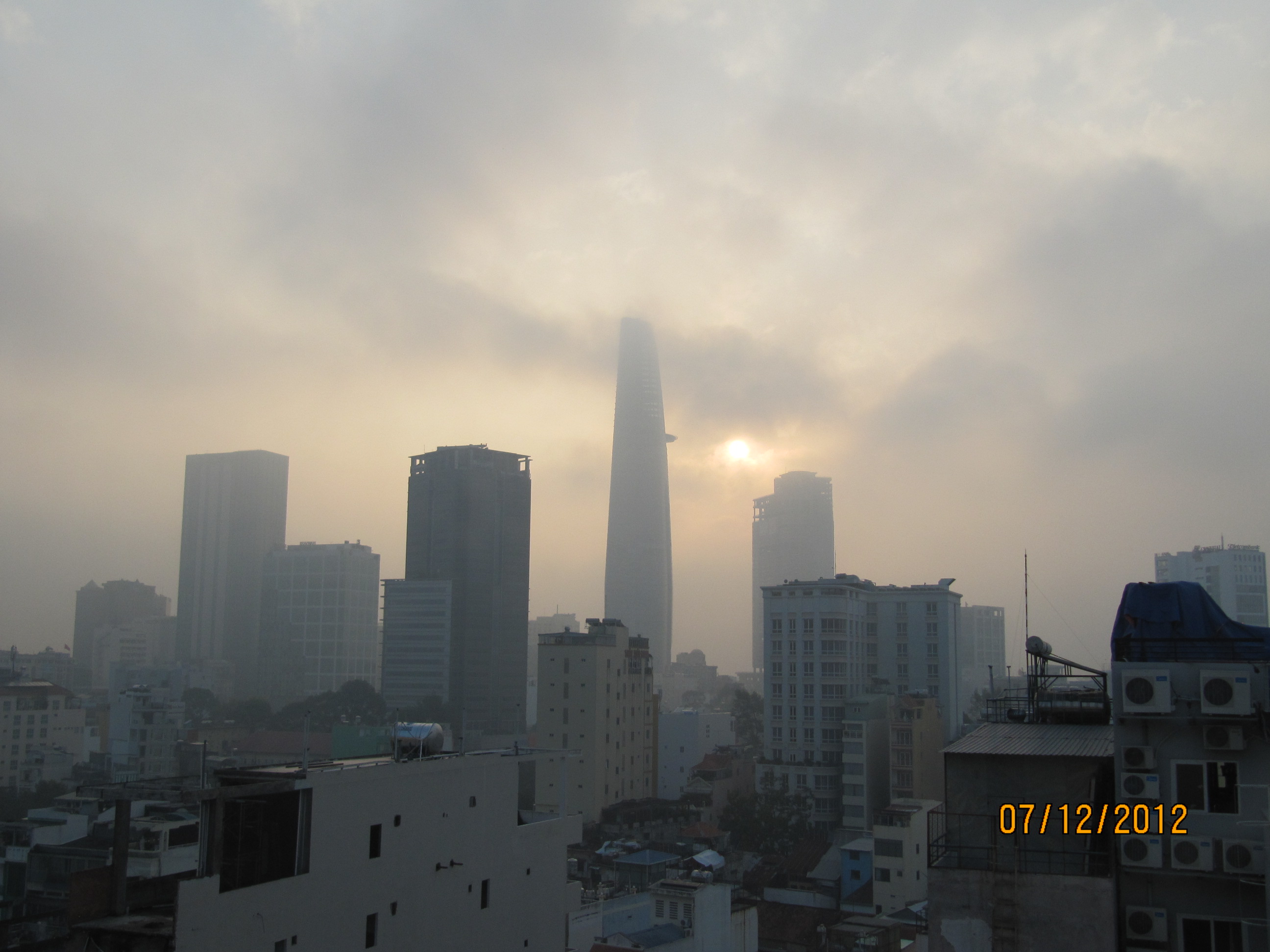 De la chambre de notre hôtel, au 10è étage, vue sur la plus haute tour, le Bitexco Financial Tower. Le soir, on voit plus clairement ce que l'on en décrivait, la pétale de lotus symbolisant le dynamisme économique de la ville. Le lendemain matin (la date n'a pas été ajustée sur mon appareil!), smog sur la ville. À l'oreille, le brouhaha d'une école primaire qui monte d'en bas ...