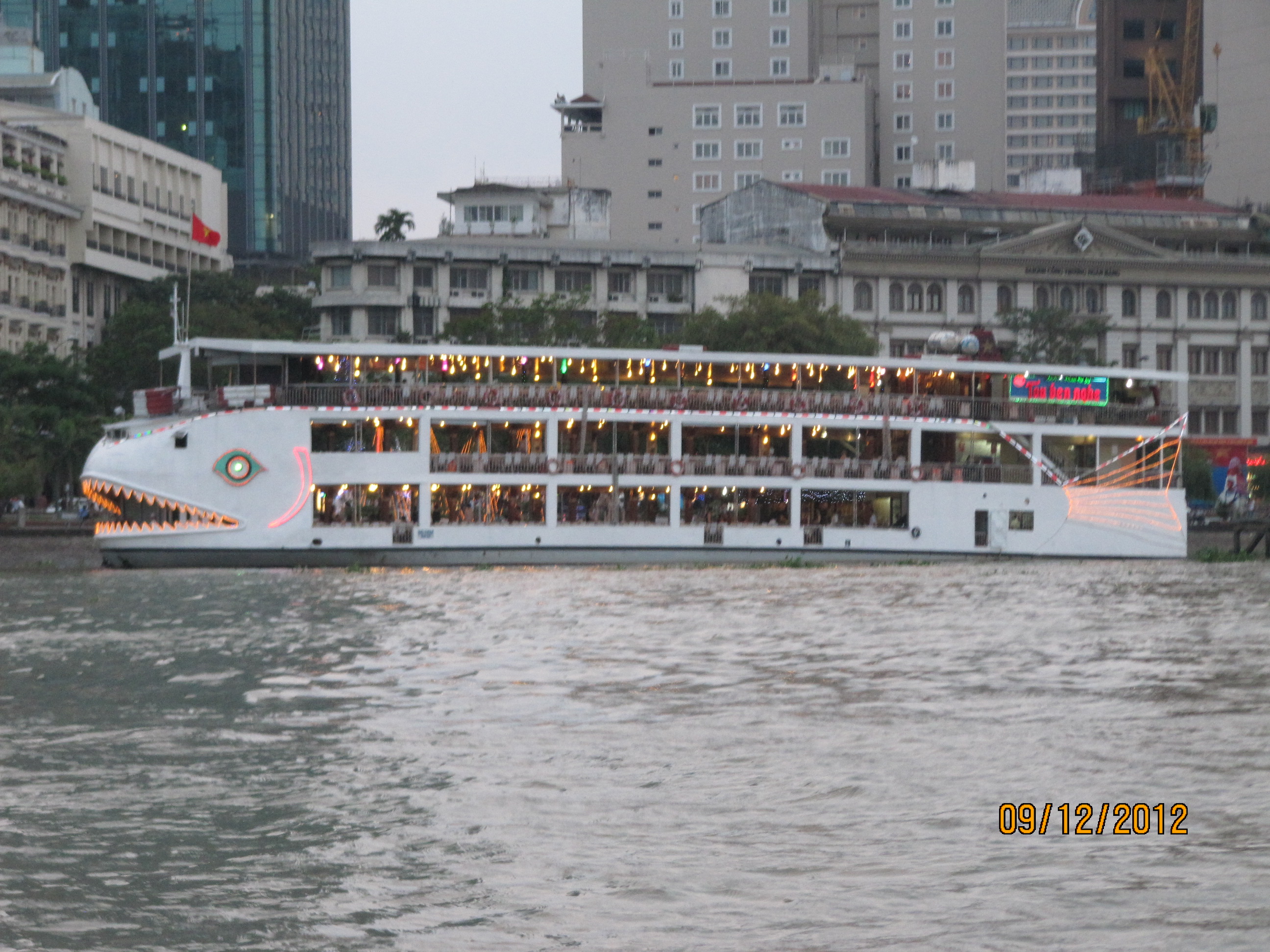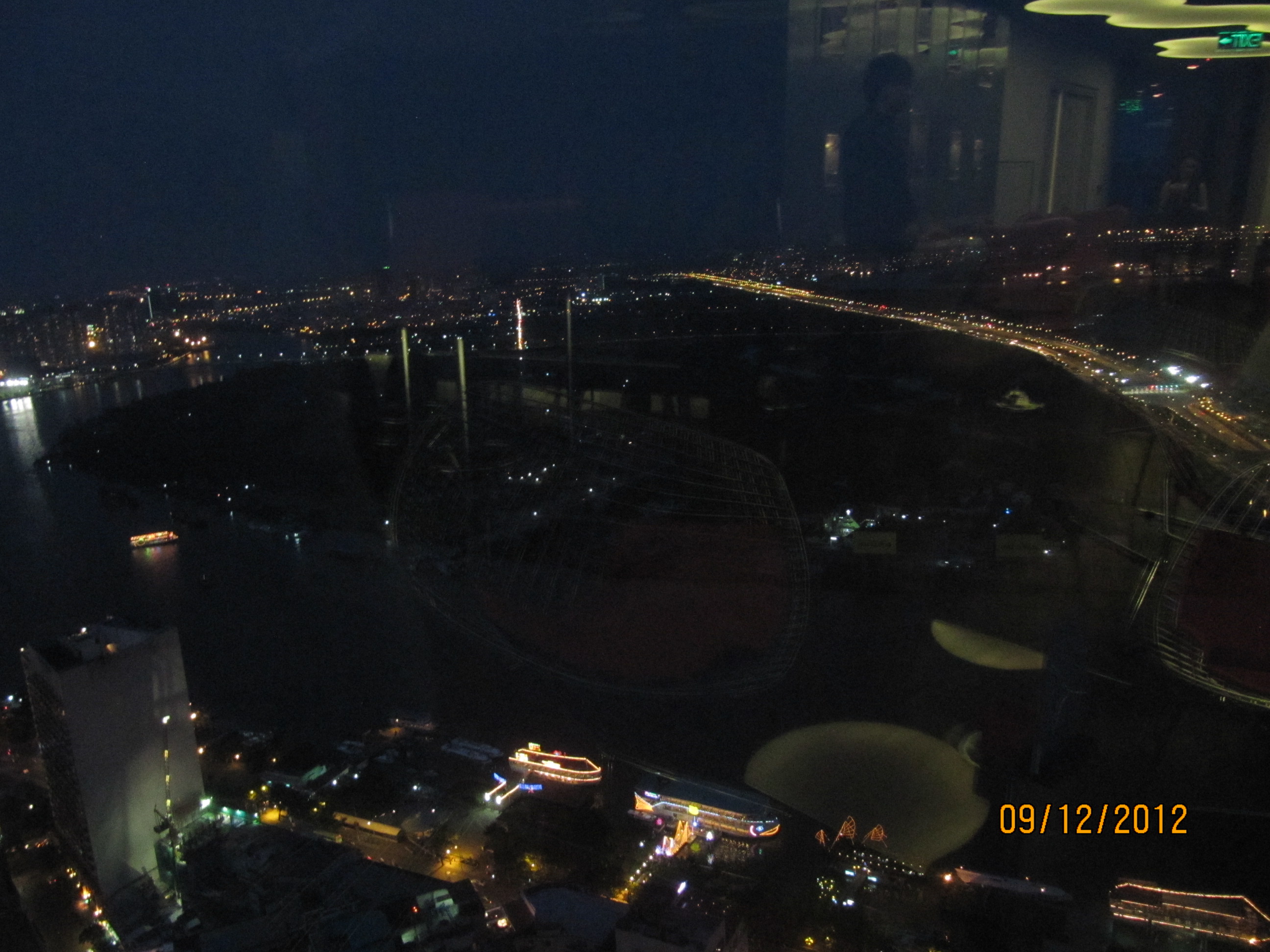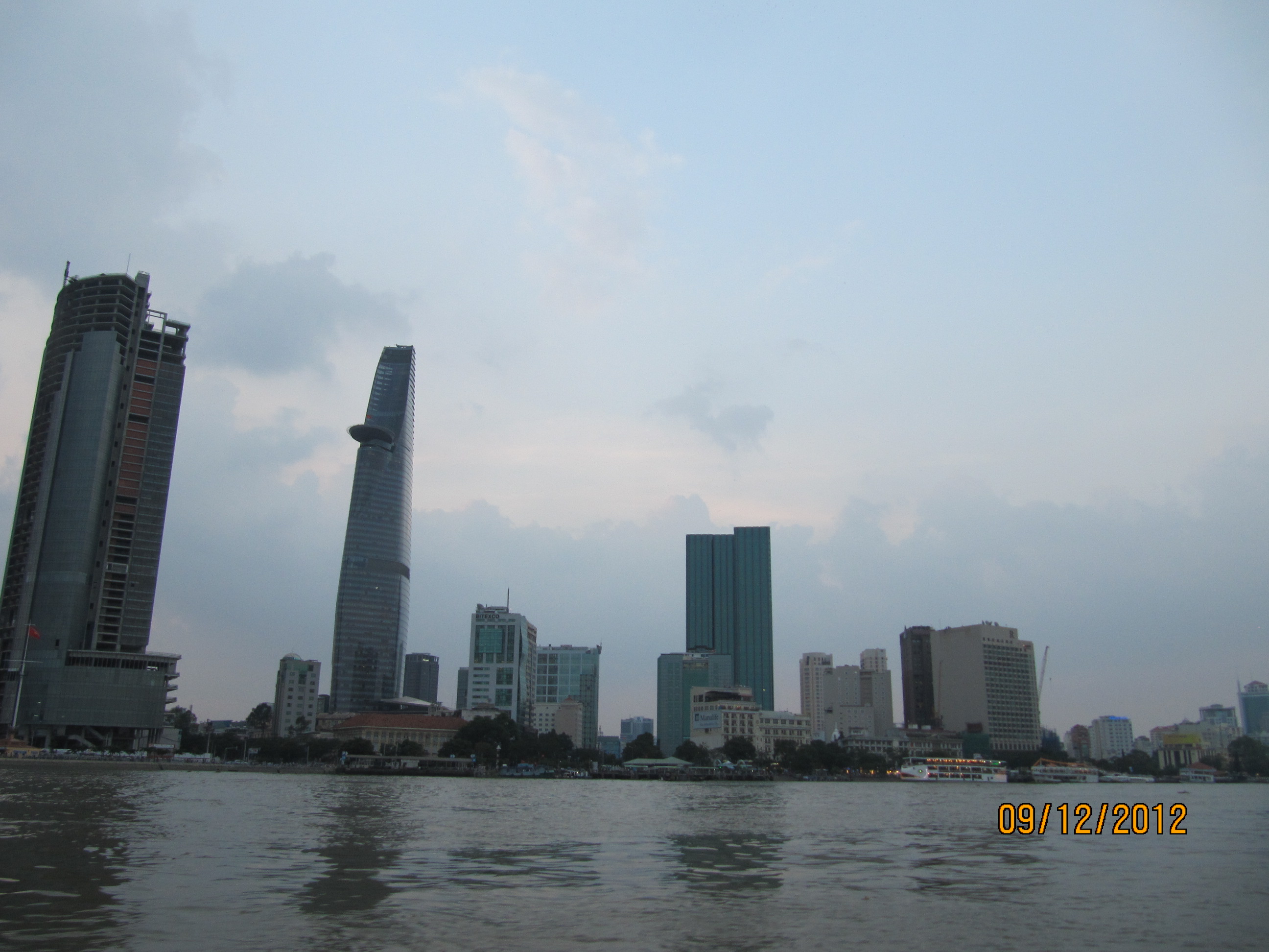 Le lendemain, accompagnés de ma cousine, nous étions sur le fleuve de Saïgon dans une petite embarcation. En serpentant dans les bras du fleuve, nous avons pu voir la tour au loin alors que le soleil descend. Pourtant, en revenant au port, il fait encore clair. Mais à peine une demie-heure plus tard, nous étions au bar, grignotant un plat de fruits et un plat de fromages. C'était pour ne pas payer les frais d'entrée à l'observatoire à quelques étages plus bas. Les sièges y sont inconfortables, le décor très jeune mais une belle compilation de musique occidentale.