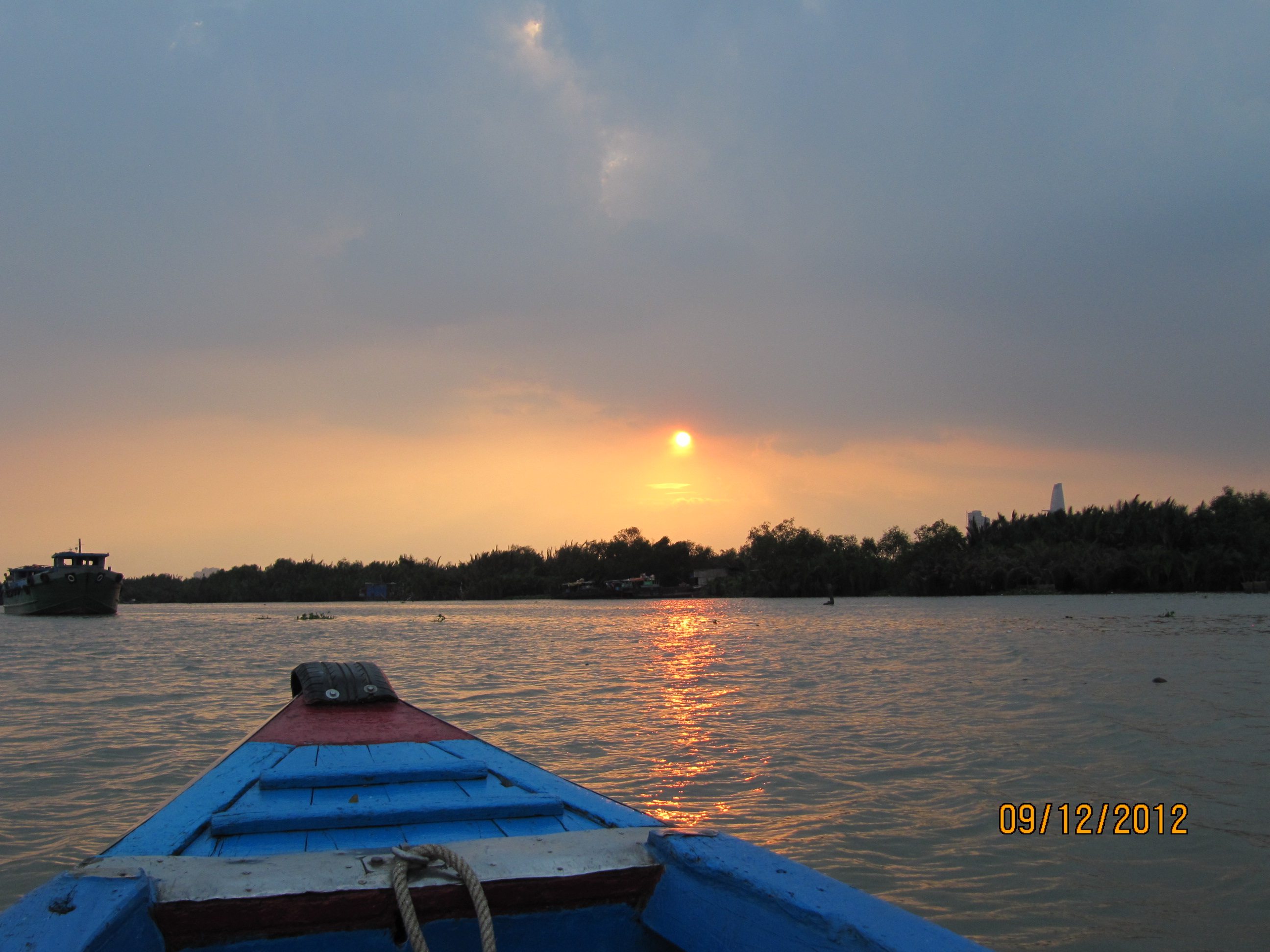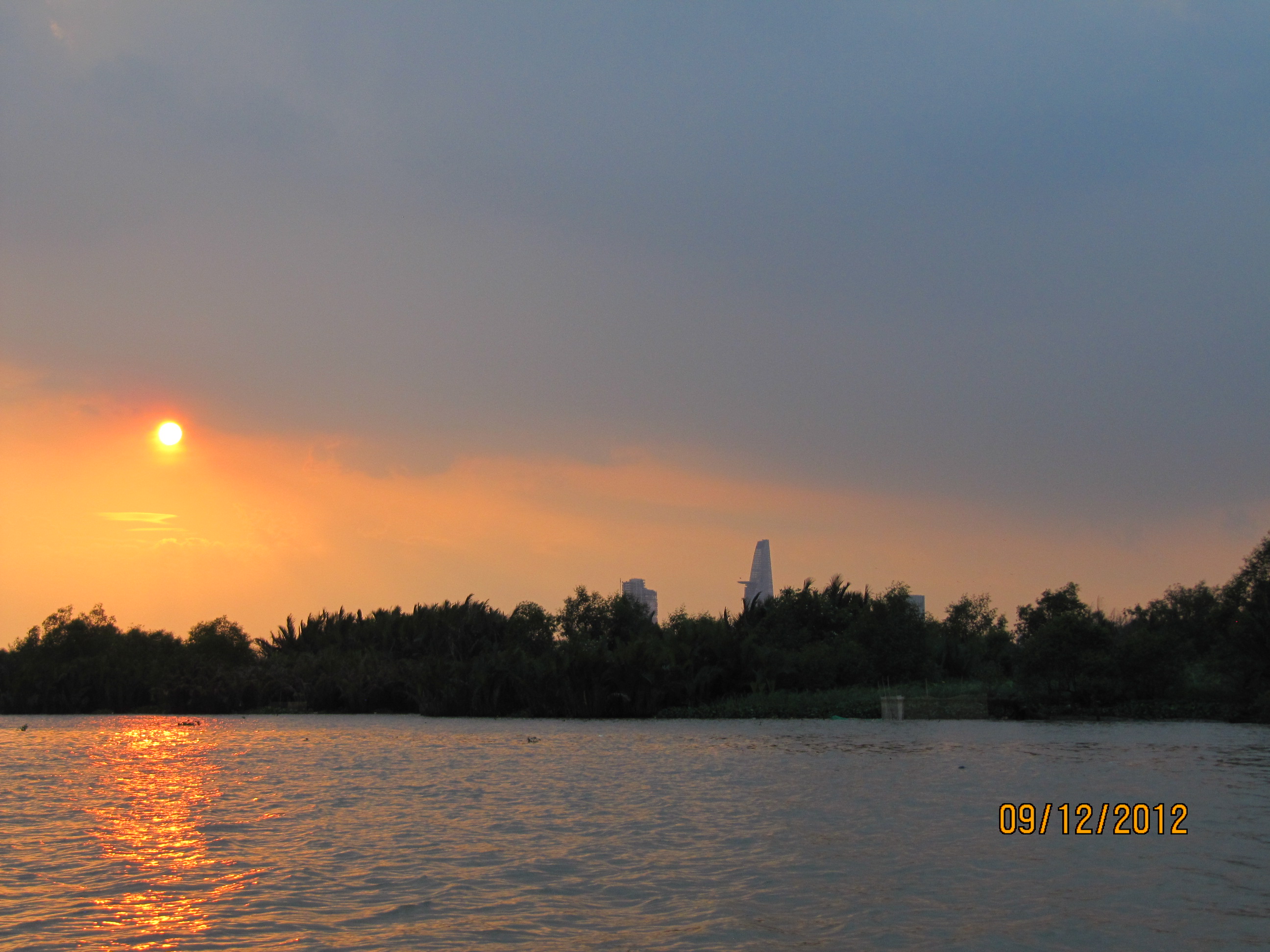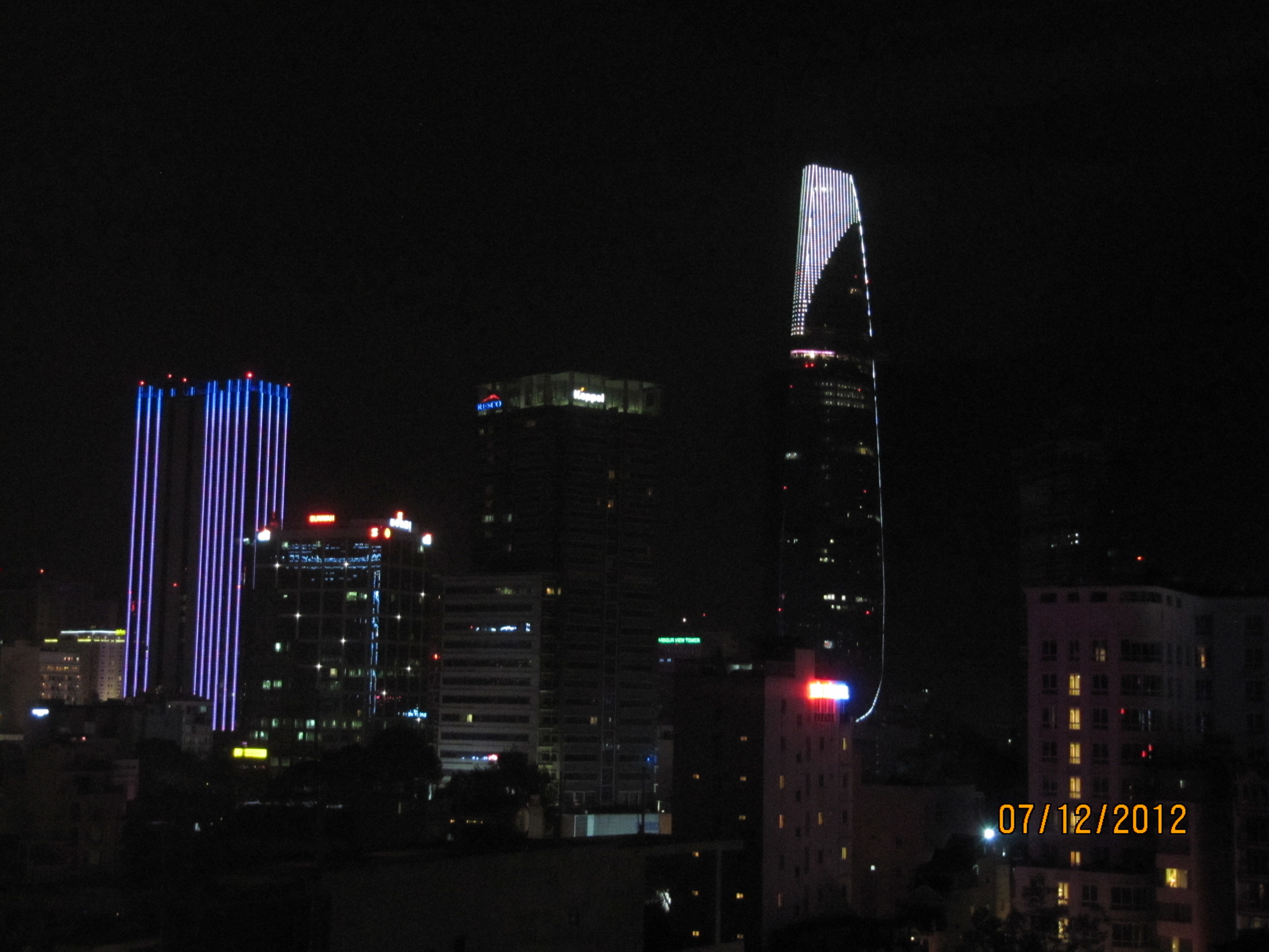 Le lendemain, accompagnés de ma cousine, nous étions sur le fleuve de Saïgon dans une petite embarcation. En serpentant dans les bras du fleuve, nous avons pu voir la tour au loin alors que le soleil descend. Pourtant, en revenant au port, il fait encore clair. Mais à peine une demie-heure plus tard, nous étions au bar, grignotant un plat de fruits et un plat de fromages. C'était pour ne pas payer les frais d'entrée à l'observatoire à quelques étages plus bas. Les sièges y sont inconfortables, le décor très jeune mais une belle compilation de musique occidentale.