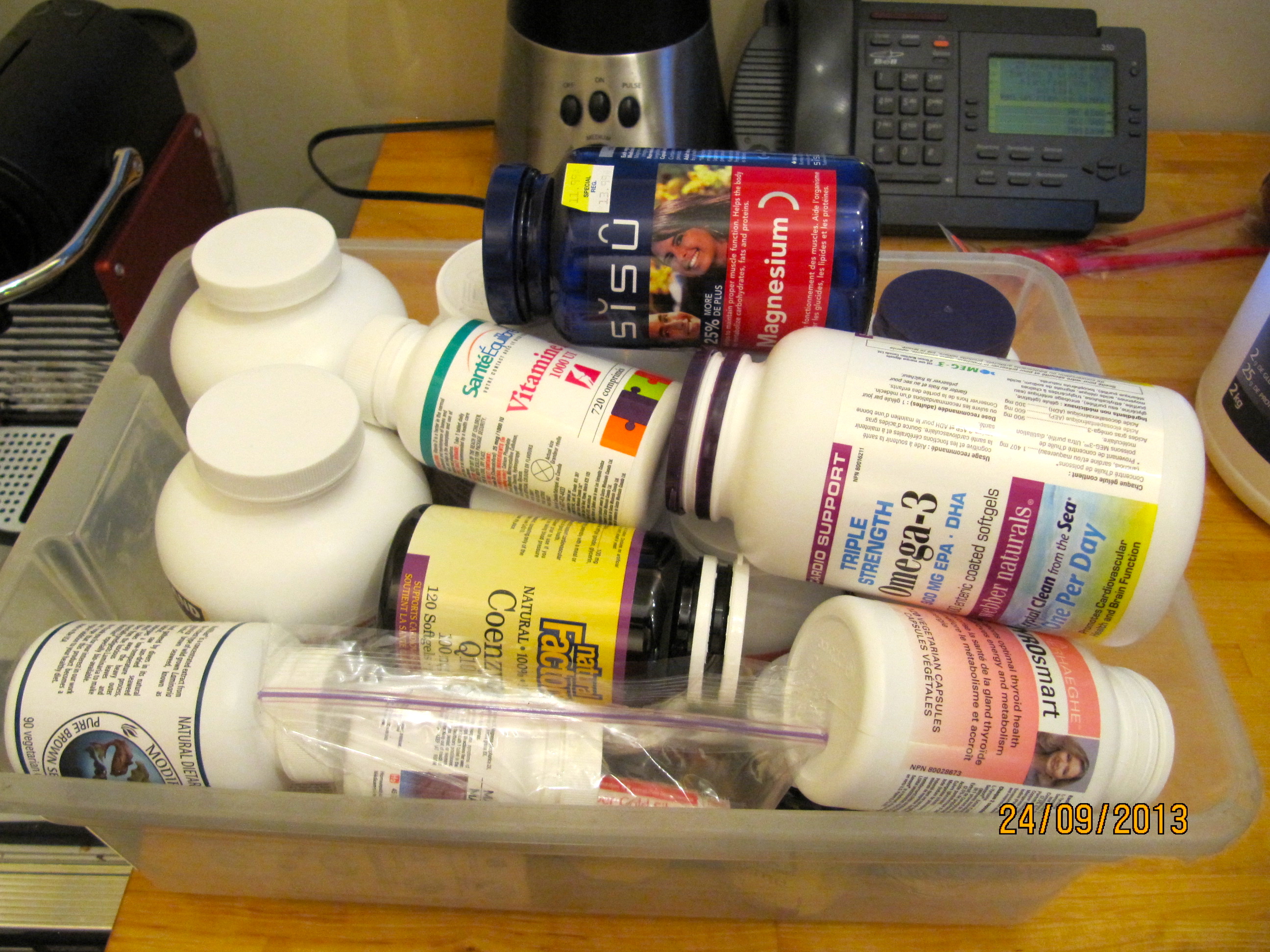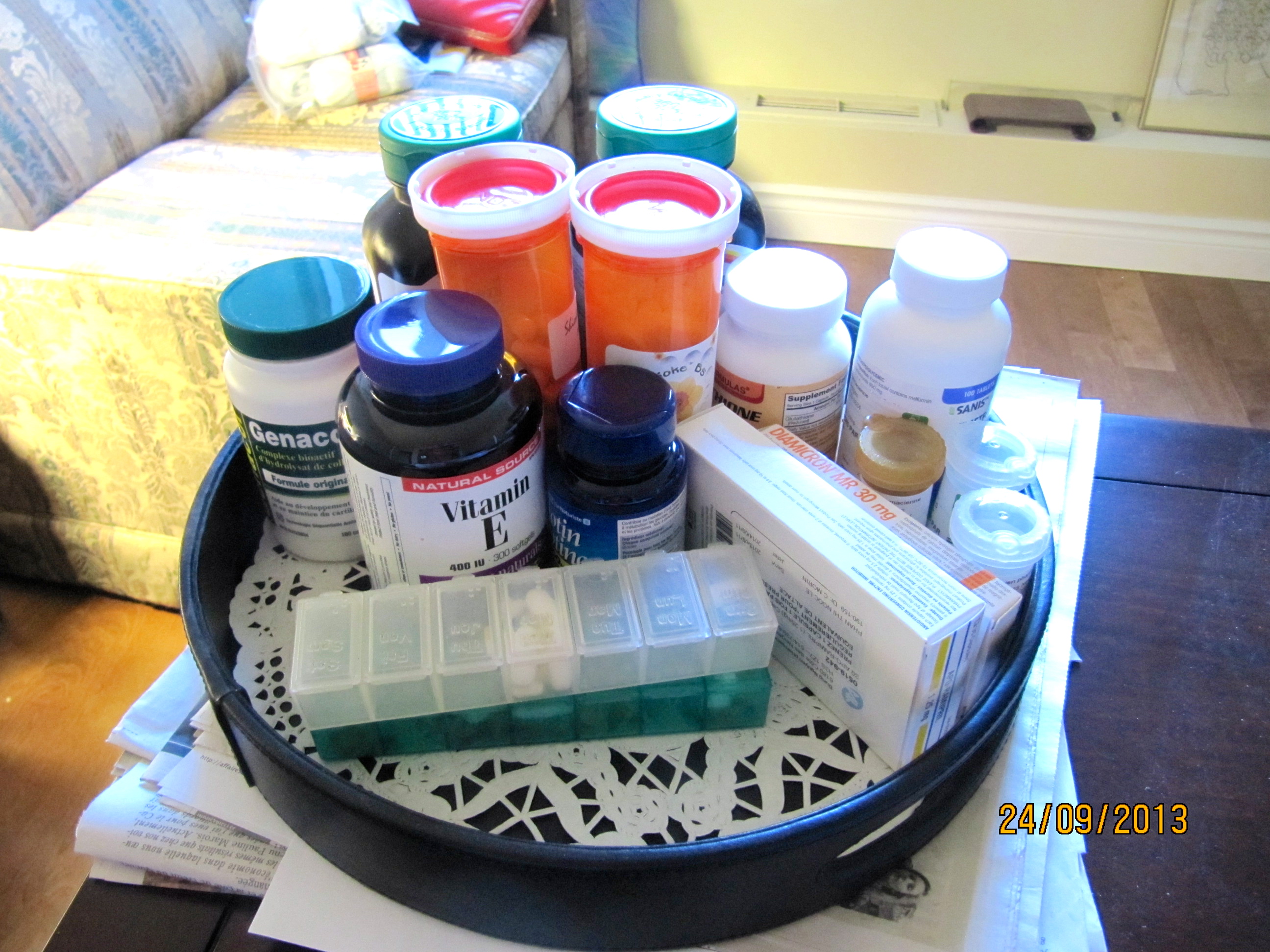 Avalanche de suppléments alimentaires et vitamines envoyés de Californie par la copine médecin qui m'a prescrit tout un programme contre les taches brunes mais aussi pour contrer ma perte de cheveux. J'en ai aussi à acheter ici. Introduction de graines de chanvre dans le «smoothie» quotidien. Des crèmes pour le visage aussi. En plus de celles que mon autre soeur commande d'autorité pour moi. Tant et si bien que j'ai dû m'écrire tout un nouveau plan d'ingestion et changer ma méthode de distribution de pilules, gelules et capsules. En plus de tout un cérémonial matin et soir que j'aurai le courage de décrire une autre fois peut-être. Commençons par le courage de m'y attaquer d'ici demain.