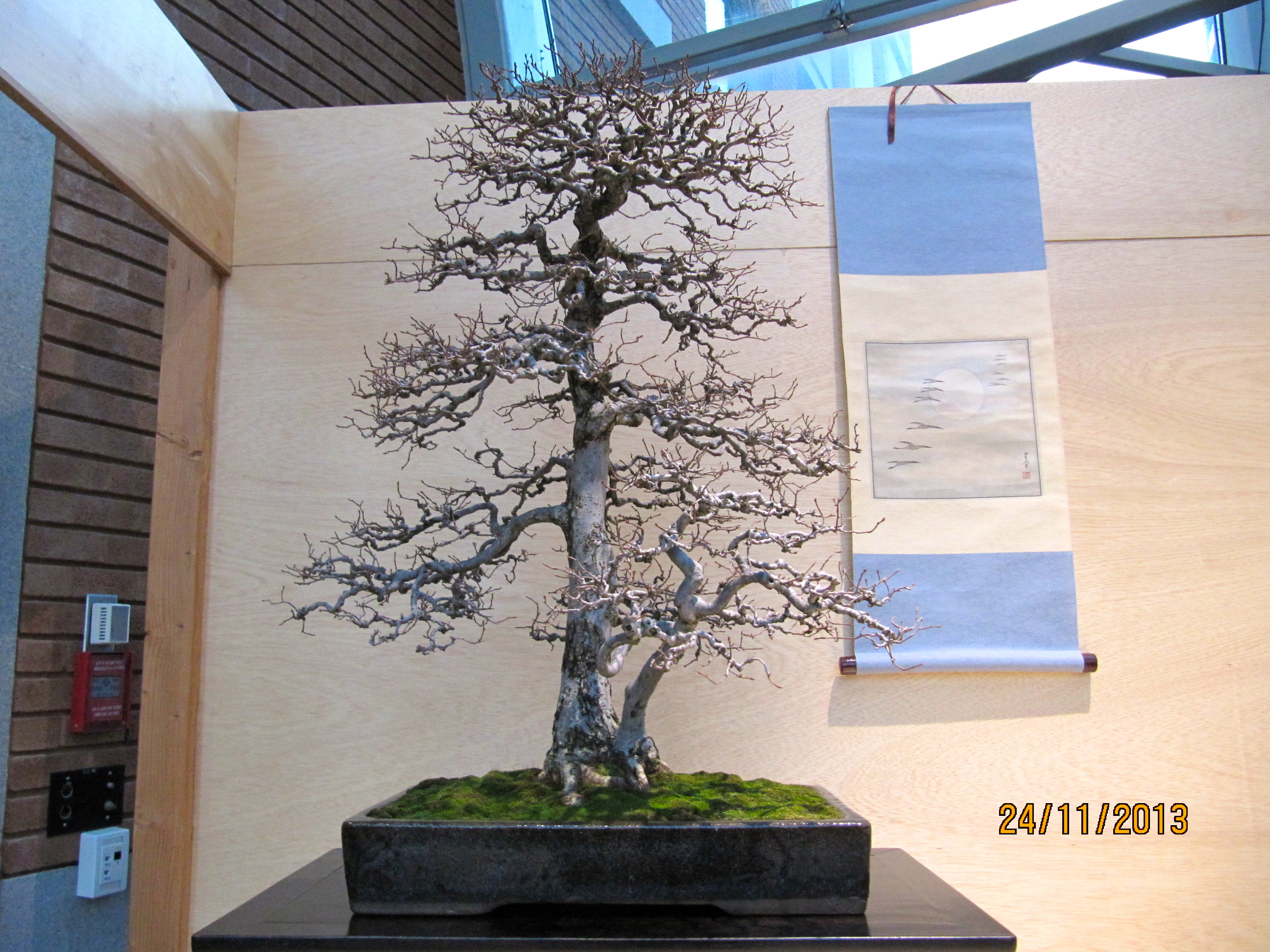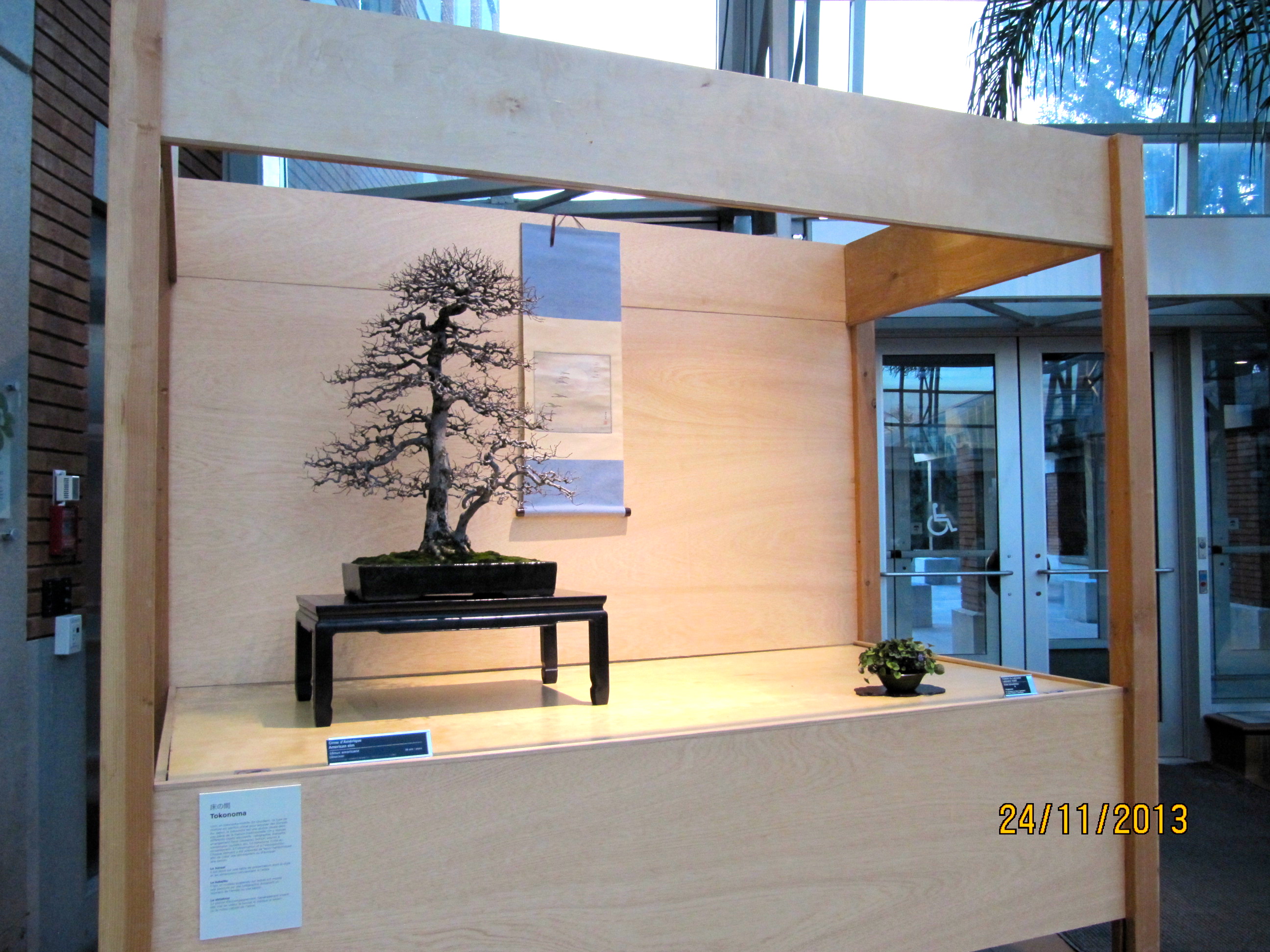 Travail encore hier après-midi sur ce dossier qui n'avance pas. Hiver et désert. En sortant, je tenais à passer au Jardin botanique qui expose en alternance un bonsaï dans un tokonoma. Je courais pour résister au vent glacial pour le bénéfice des quelques photos que voici: