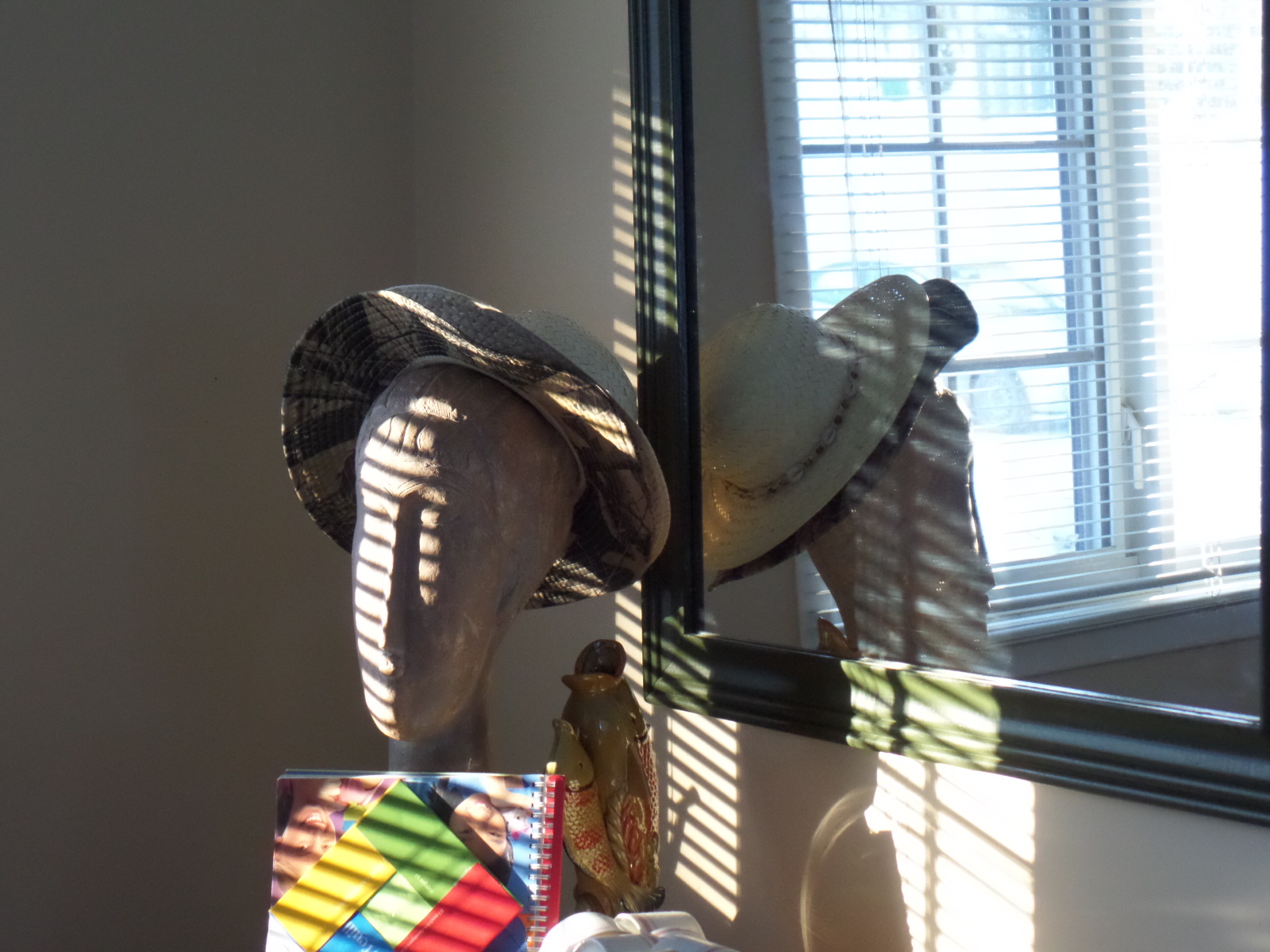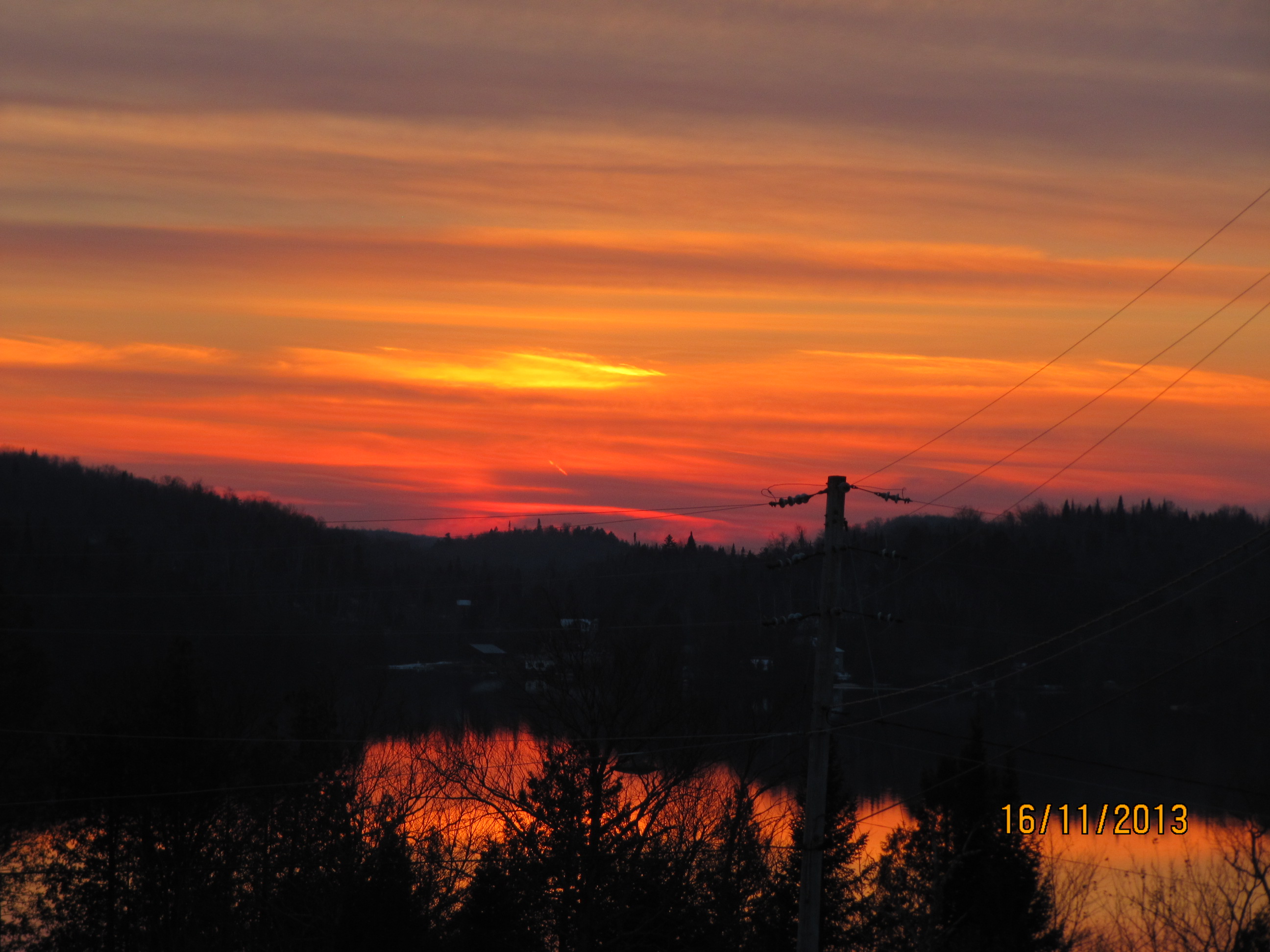 Sur la première photo, en passant la porte du vestibule, juste à l'entrée de la salle à manger, oui nous entrons par la salle à manger dans ma maison du nord, ce buste qui appartenait à ma soeur la swami, coiffé de chapeaux de paille, inondé de soleil, comme une promesse d'été. Sur la deuxième qui est prise en novembre, coucher de soleil sur le lac en contre-bas, comme une promesse des heures immobiles. Sur la troisième, prise hier, l'érable ginnala arbore ses vestiges de feuilles d'automne avec des bourgeons de printemps précoce. Je suis toute fière de ce contraste. Loin des voyages et des photos-témoins, voici mes photos d'ambiance.