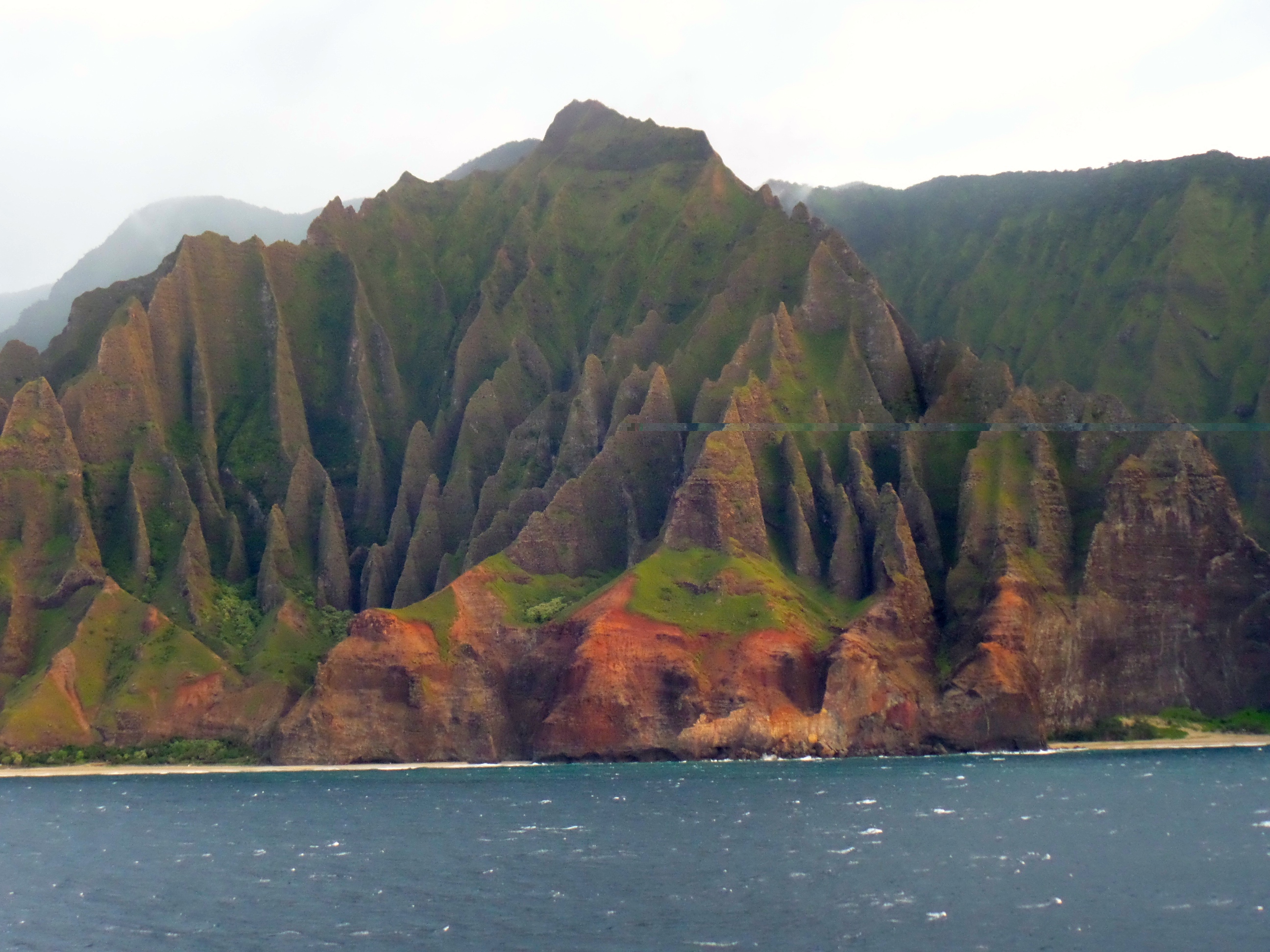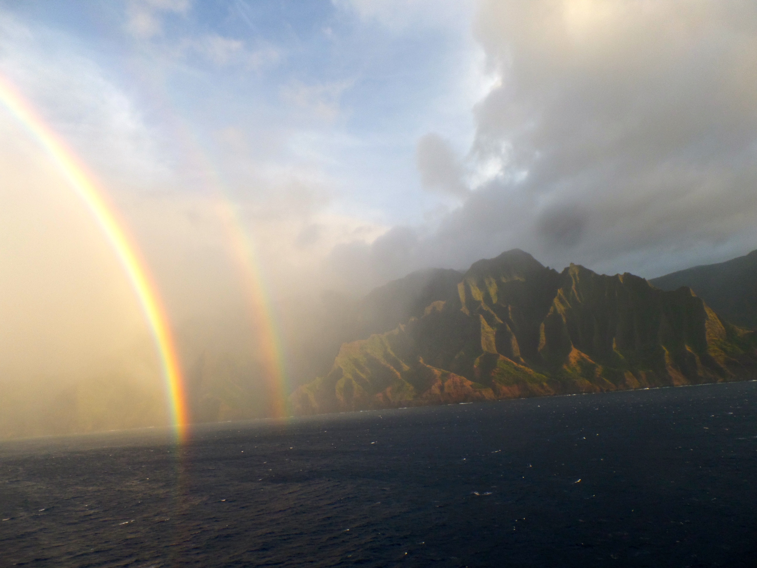 Qu'est-ce que j'avais vu aux îles hawaïennes? Énumérons: des montagnes découpées aux cimes noyés dans les nuages, des eaux turquoises où baignent les tortues vertes, des bandes de dauphins, un volcan non pas rougeoyant mais fumant quand même, de la lave noire coupante, des chutes d'eau, des arc-en-ciel. Des surfeurs certes, des restaurants mobiles qui servent des crevettes à l'ail, les pires sont à Waikiki, les meilleurs sont au North Shore.
