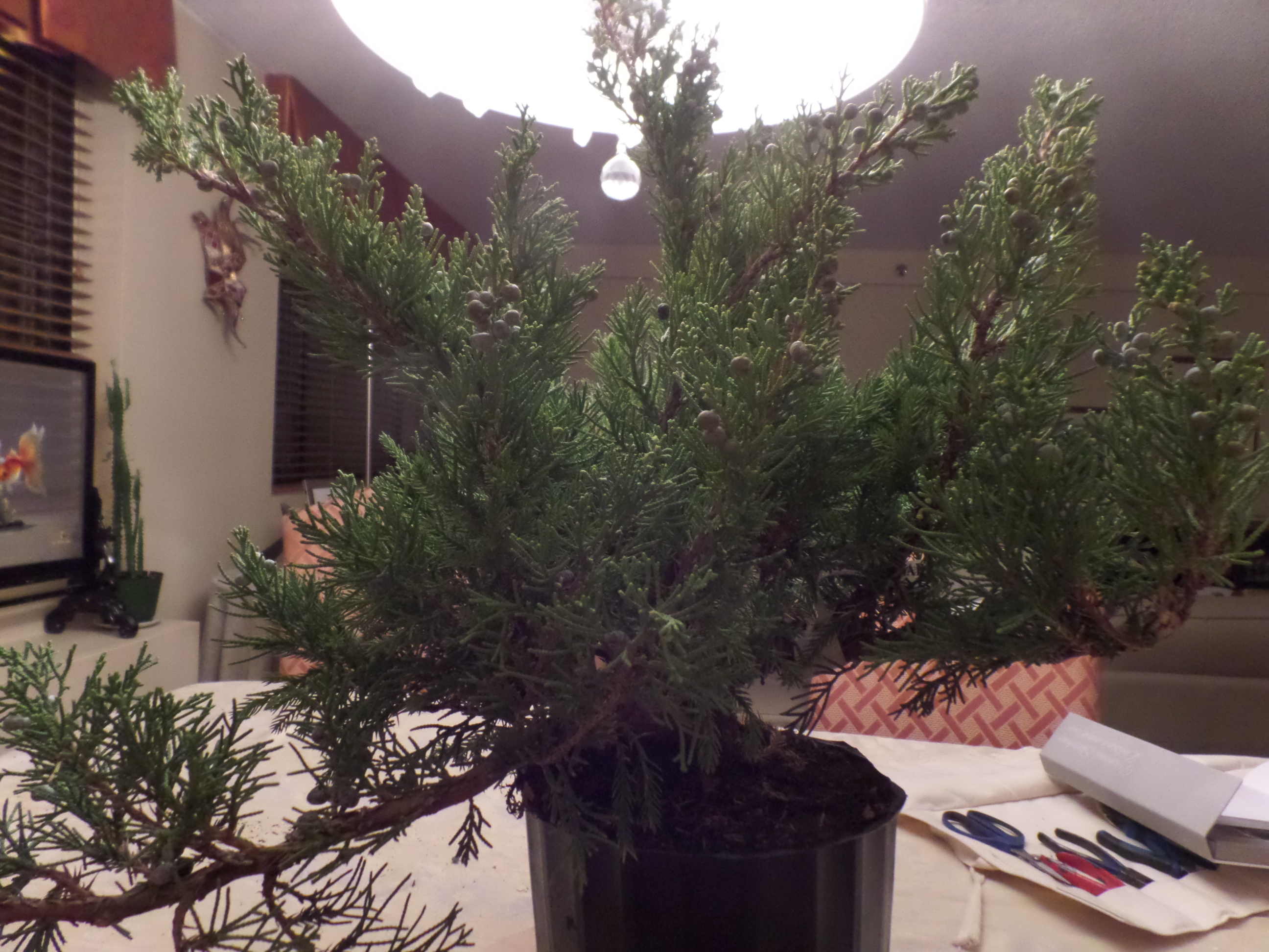 Je révise mes notes avant de tailler les arbres, les ligaturer puis les rempoter. Je tâtonne toujours, sans trop oser, surtout pour ne pas changer la forme non intentionnellement.