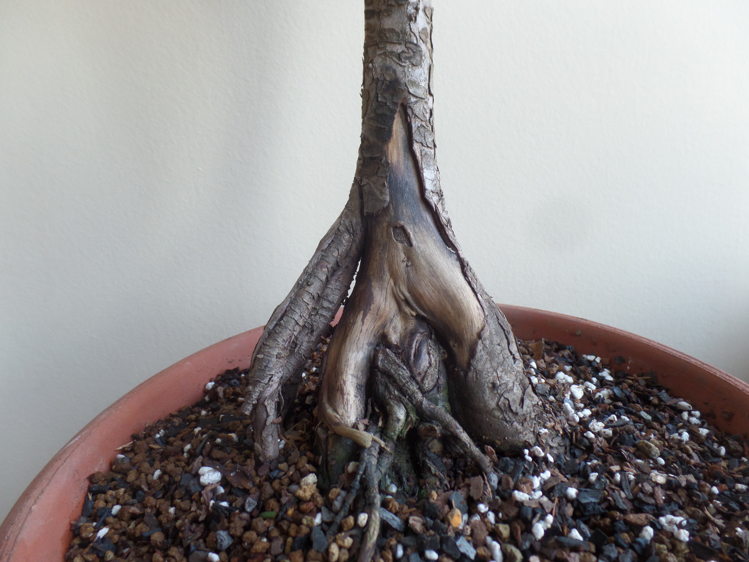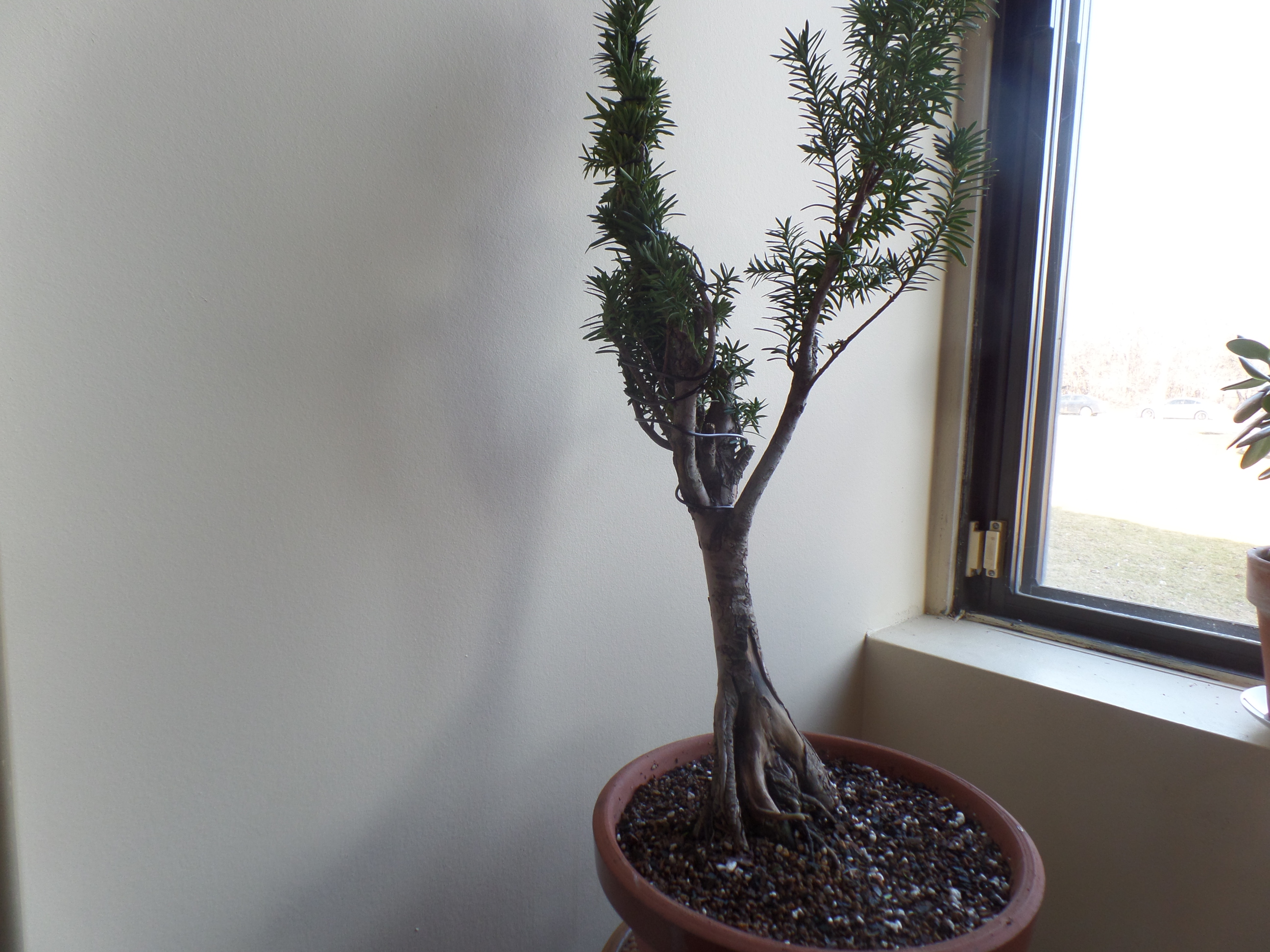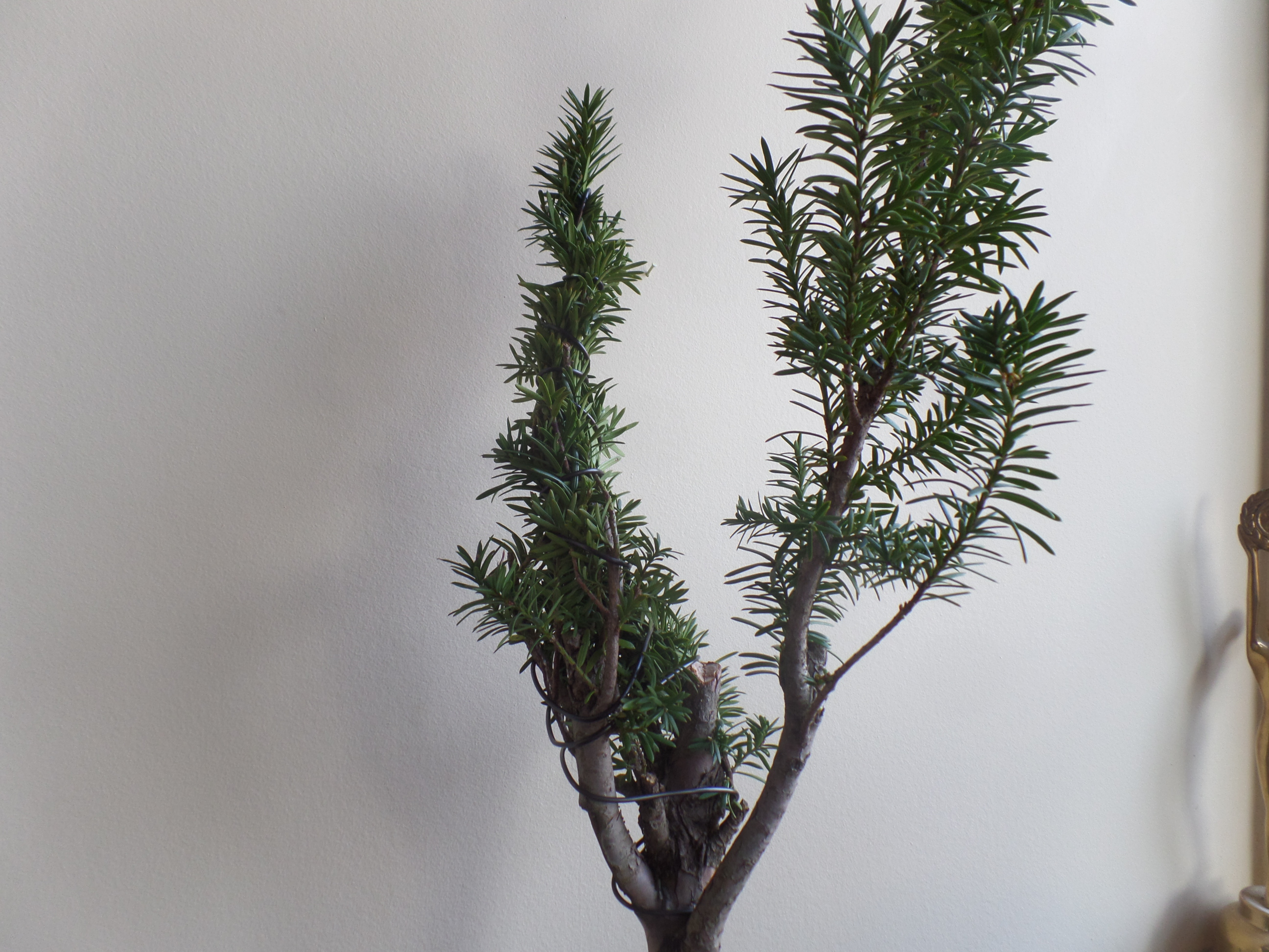Un nebari très prometteur pour en faire un shari. Un seul tronc gardé, les autres branches sont attachées pour qu'elles meurent doucement. Un if rempoté avec inclinaison. Il me reste de trouver une roche pour caler sur la face arrière du nebari.