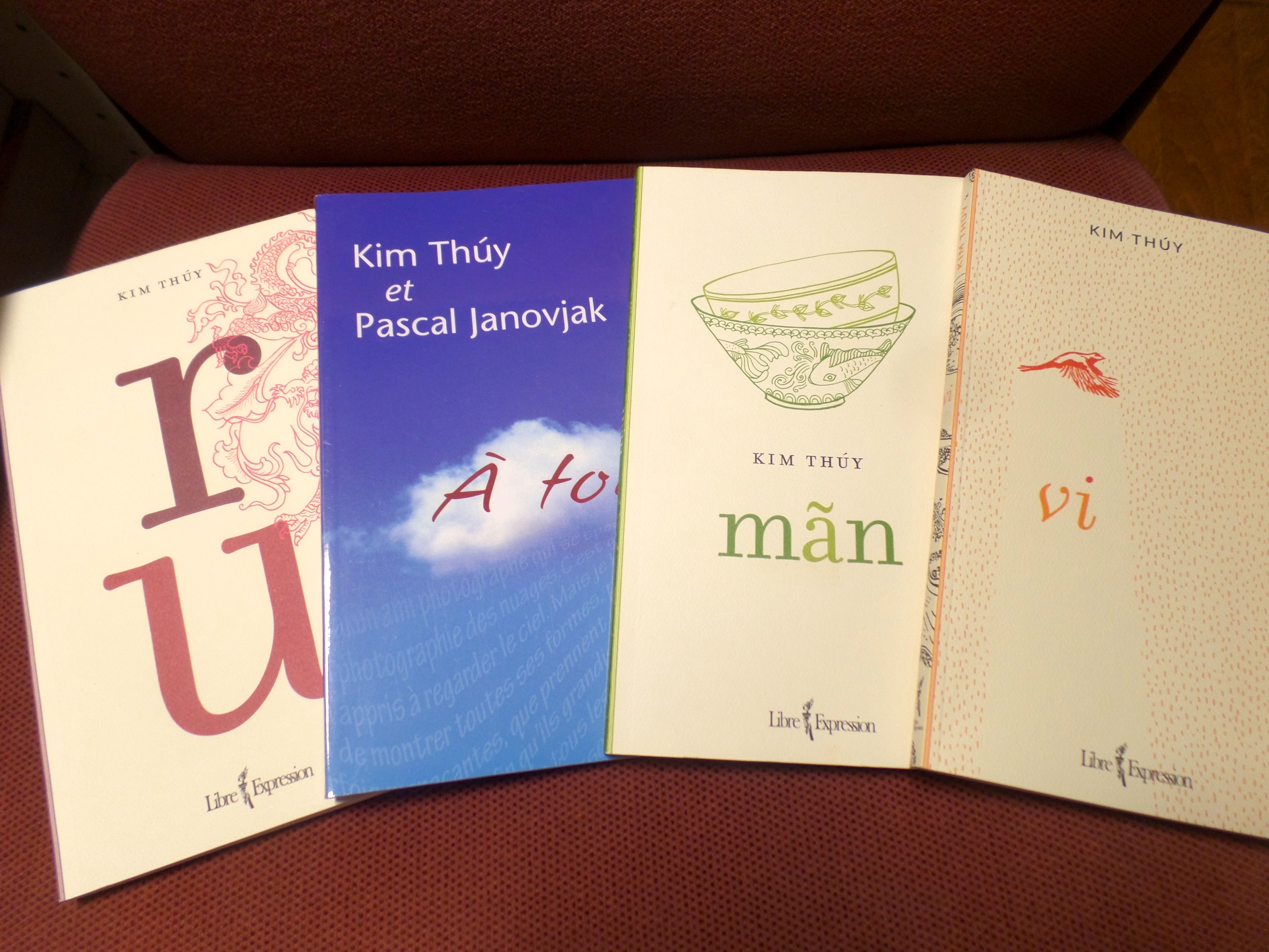 Ce soir, j'ai commencé à lire la dernière plaquette de Kim Thúy, «Vi», ses romans sont si minces. Je ne la prenais pas au sérieux, cette écrivaine d'origine vietnamienne, à sa première plaquette, «Ru», peut-être un peu jalouse du fait qu'elle a su récupérer en mots des bribes d'histoires vécues par des milliers de vietnamiens, non pas que par elle seulement. Allez, pour faire amende honorable, je vais relire tous ses livres.