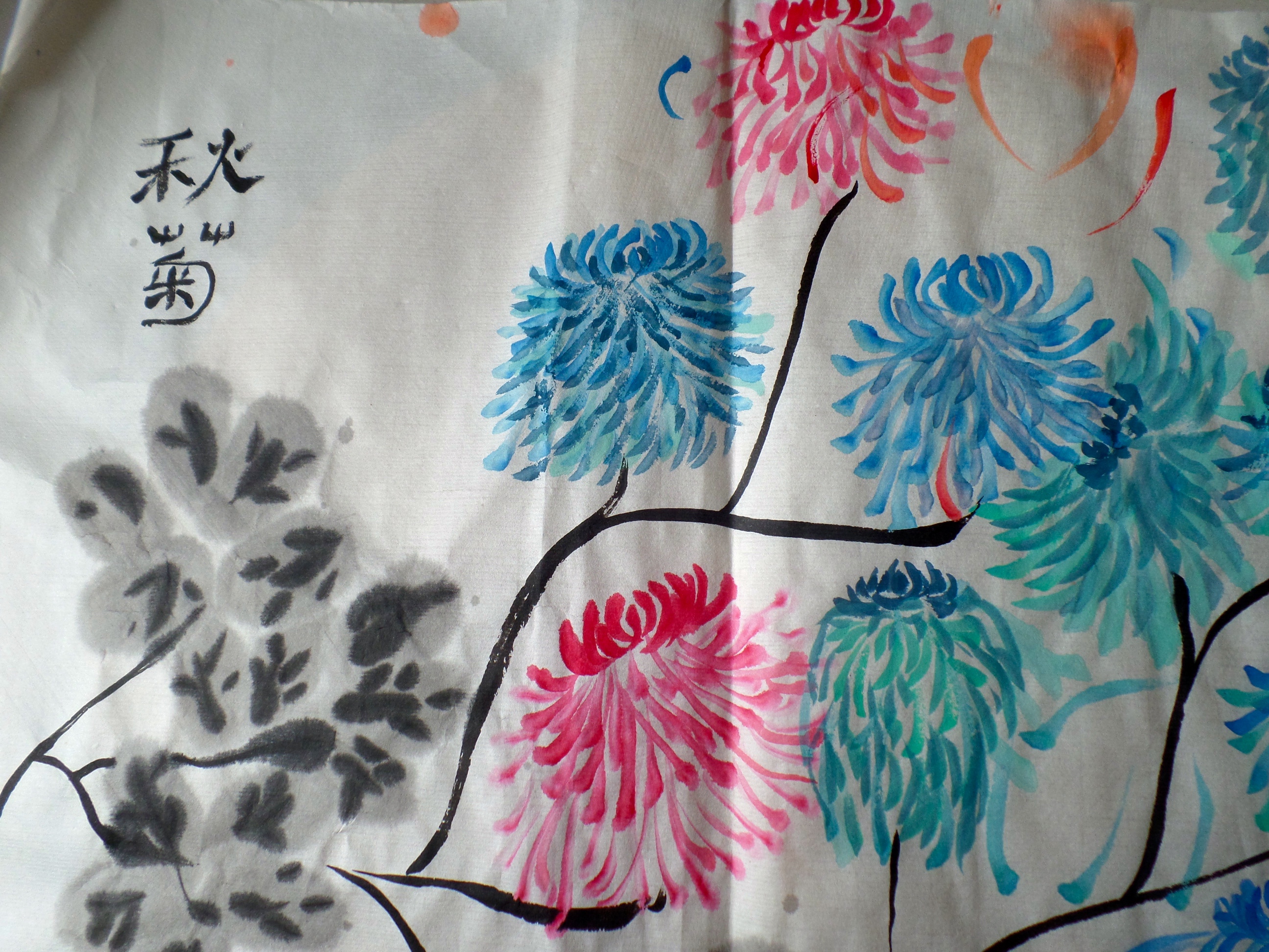 À la peinture chinoise, je faisais des chrysanthèmes d'automne qui ont plutôt l'air des dahlias disait ma camarade. Enfin, je m'amusais et ne pensais à rien d'autre pendant que j'y étais.