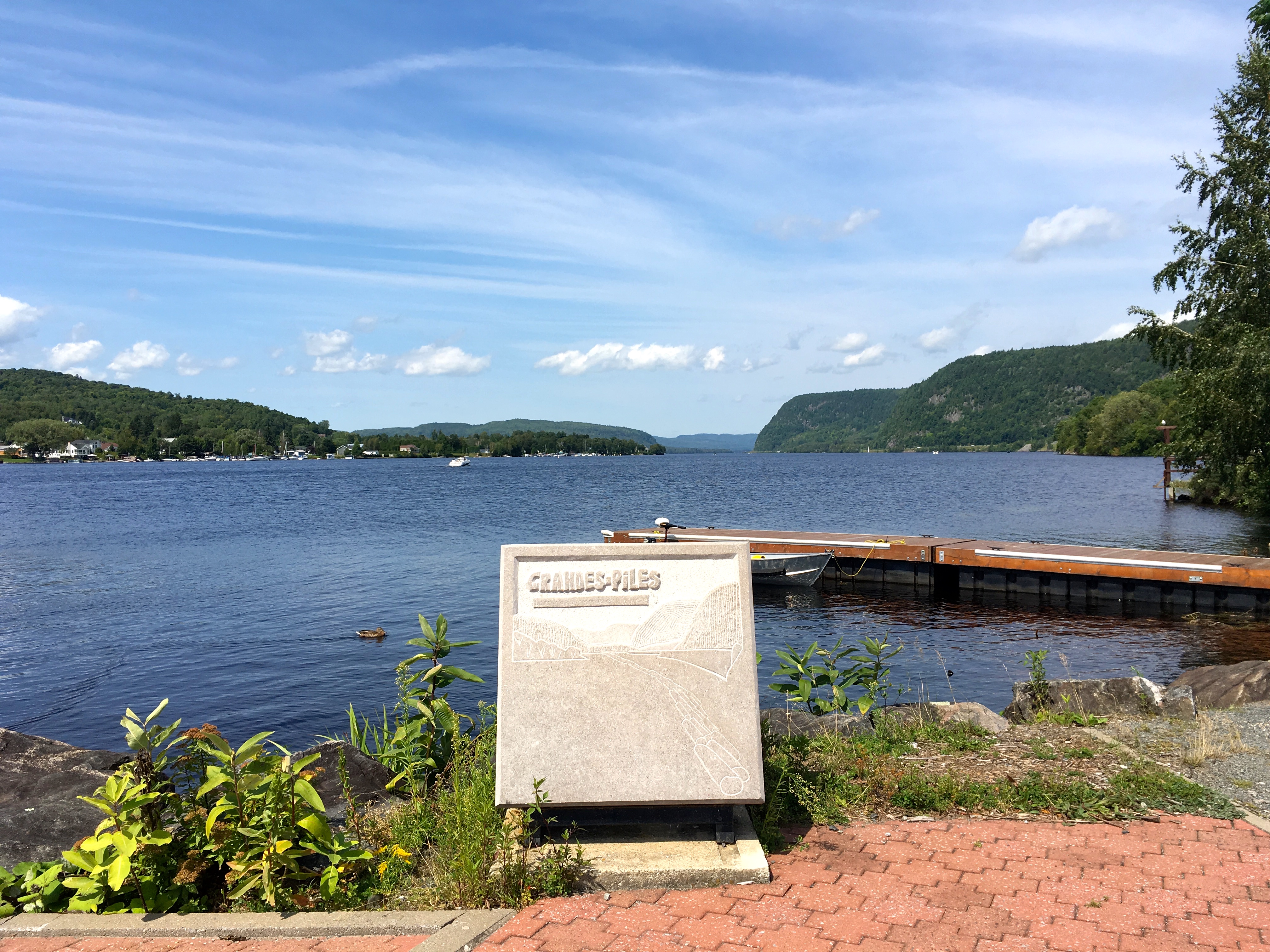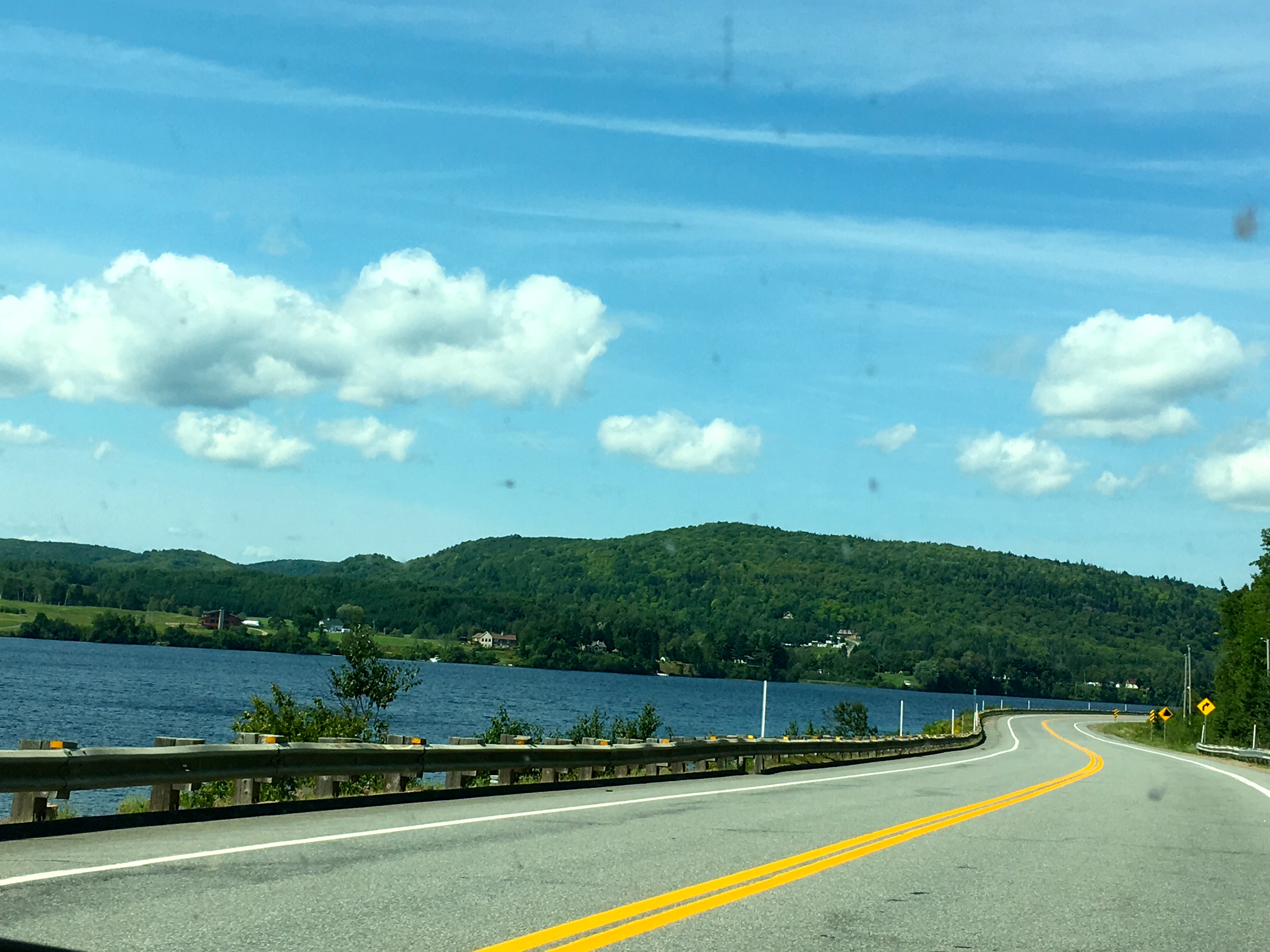 Enfin, nous atteignons la portion de route panoramique à Grandes-Piles. La rivière Saint-Maurice longeant la route, rivière d'un côté, falaise et montagne de l'autre. Un charme certes, mais à l'automne, ce serait plus beau. Les camions filent vite. Les fardiers alourdis amènent les troncs d'arbres à la scierie. La décapotable ne donne pas sa place. Nous sommes au soleil et au vent, casquette vissée sur la tête. Je commence à digérer la précipitation du matin. Le tournis passe. Mais je ne savoure définitivement pas encore le plaisir anticipé pour dans quatorze mois. La dernière fois que j'ai acheté un voyage si longtemps d'avance c'était la croisière en Méditerranée.