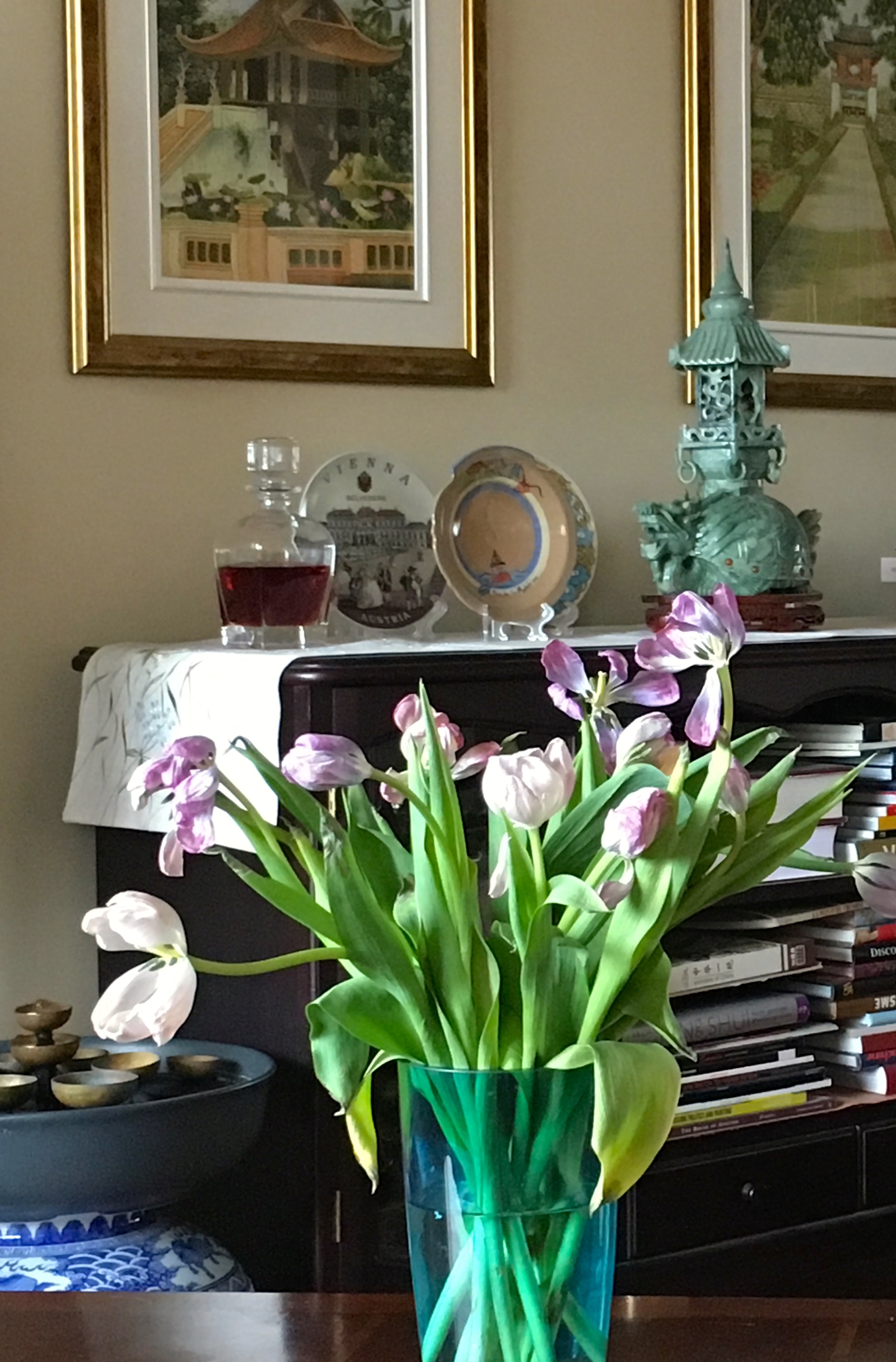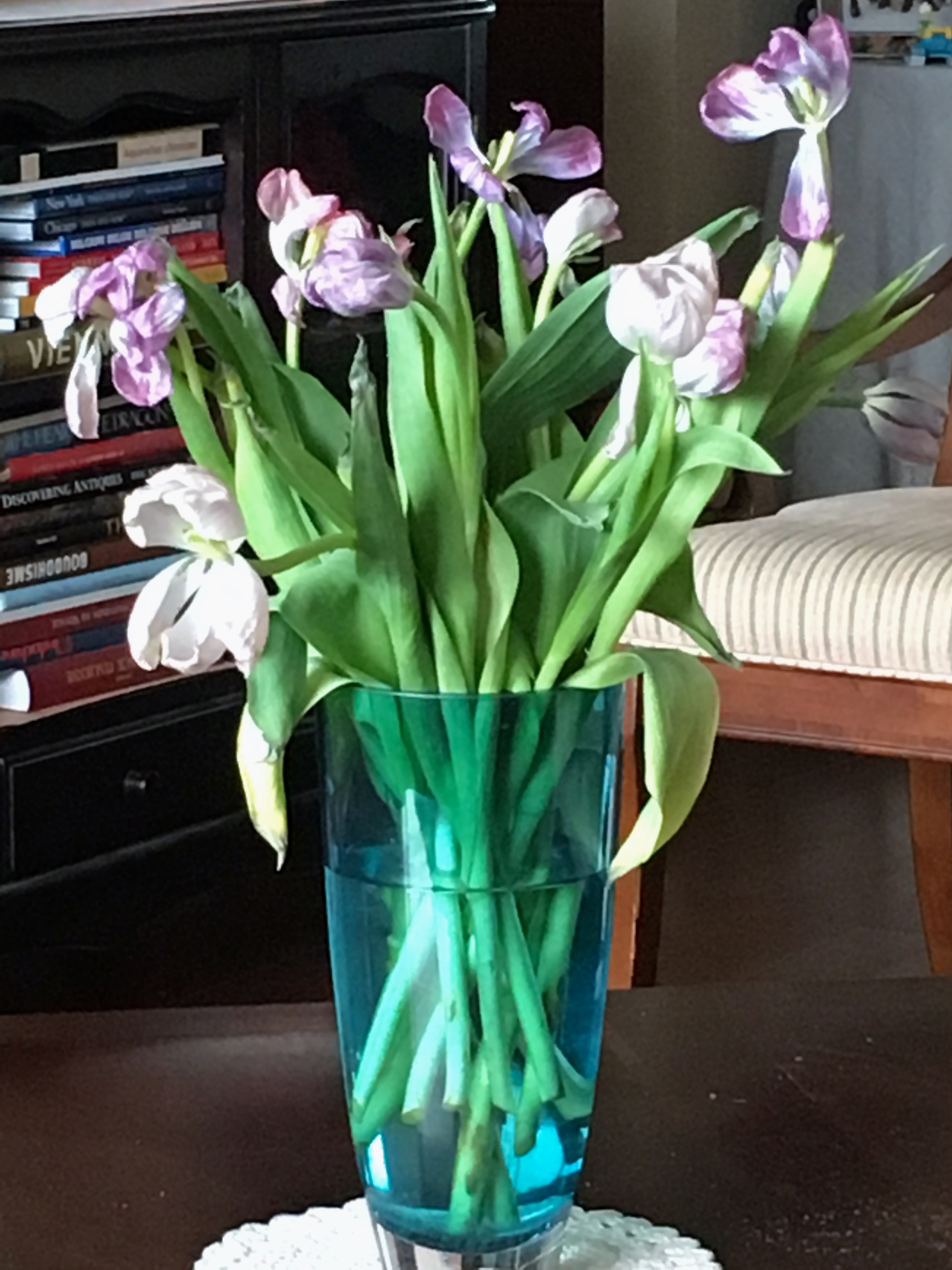 Je me suis achetée des tulipes la semaine dernière. Elles n'ont pas été très belles pendant toute la semaine et puis, depuis trois jours, alors que les pétales s'amincissent et se dessèchent, elles sont devenues séduisantes et attachantes. Tant et si bien que je n'ai pas arrêté de les prendre en photos. Elles sont comme représentatives de cet âge des femmes d'une beauté translucide que l'on admire sans trop oser les toucher, de peur qu'elles ne se fanent là devant vos yeux. Cette nuit peut-être, des pétales tomberont, comme ces personnes qui s'effacent sans faire de bruit.