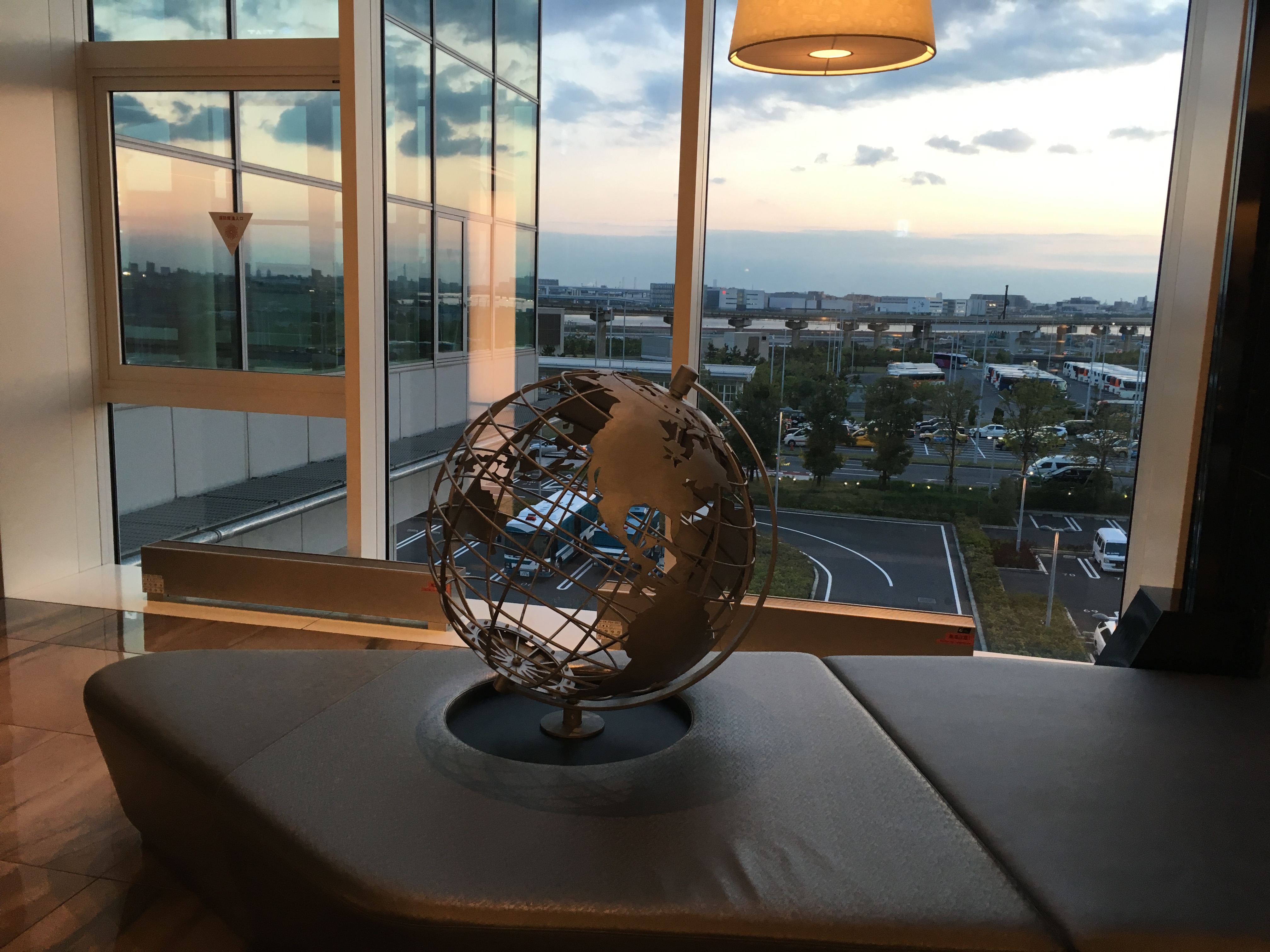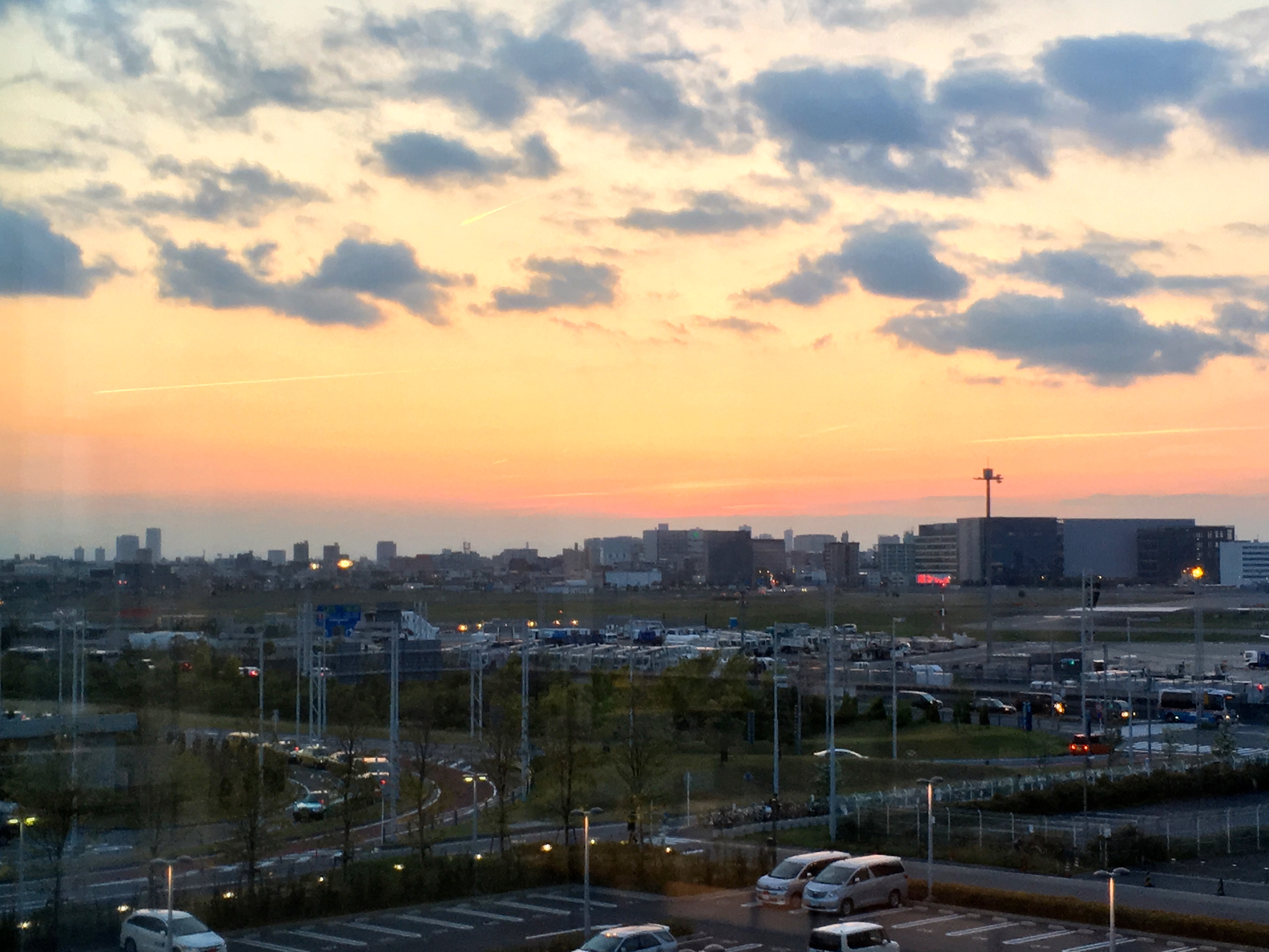 Coucher de soleil au premier soir de notre arrivée au Japon. Nous étions à l'aéroport Haneda et à l'hôtel The Haneda pour la nuit. Ma compagne de chambre cherche désespérément une sortie pour humer l'air à l'extérieur, sans succès. Souper sur place. L'air frais sera pour demain matin, avant de reprendre un vol intérieur pour Hakodate, sur l'île de Hokkaido, dans le nord du Japon. Espérons y trouver des cerisiers en fleurs, comme nous avons raté la saison sur l'île de Honshu.