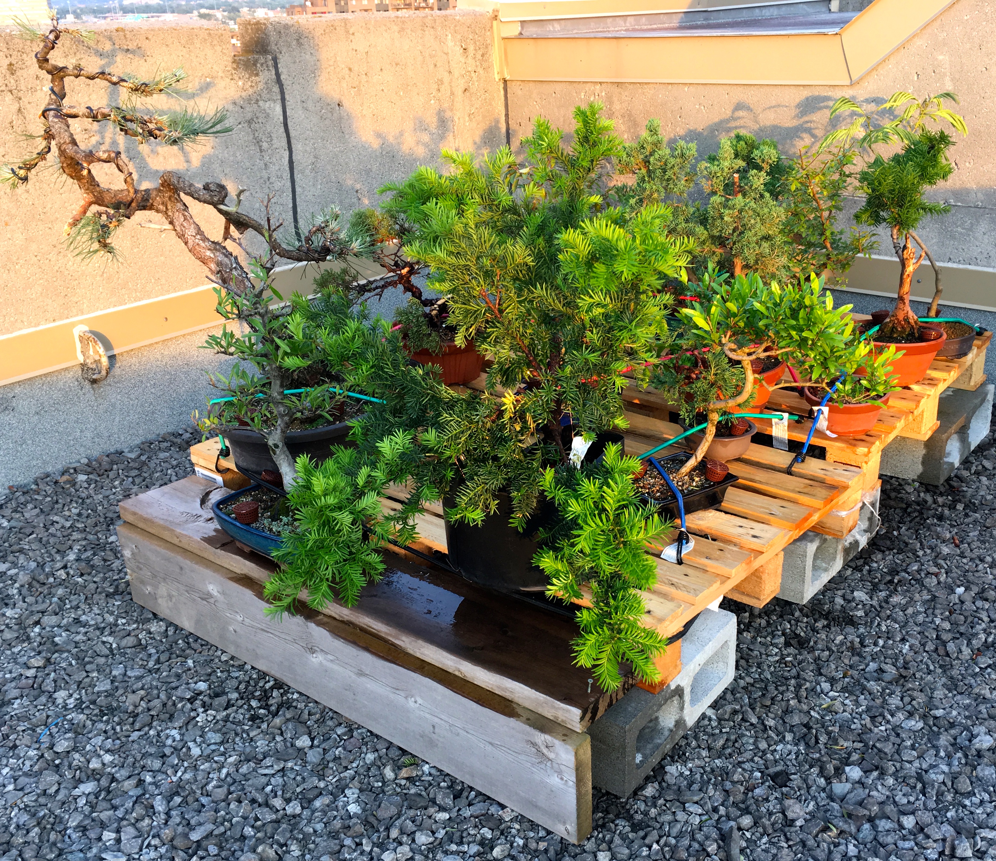 Virée sur le toit pour arroser mes arbres que Lui avait aidés à attacher ce matin, après le petit-déjeuner, puisque les coups de vent en bourrasques ont renversé quelques-uns, sans dommage.