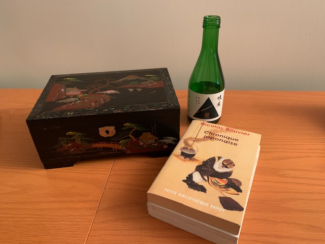 La bouteille de saké que j'ai gardé en référence, la boîte de musique vintage et deux livres de Nicolas Bouvier, «Chronique japonaise» et «L'usage du monde»