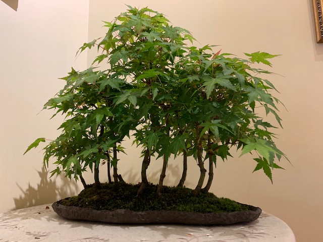 Sur cette page, la forêt d'érables si belle il y a un mois. Elle est morte maintenant, depuis deux semaines. J'avais tardé de venir l'arroser. M'attendre trois jours, c'était trop pour elle. Je pourrai la ressusciter si je la dorlote beaucoup mais je ne le fais pas. Un de moins à m'en occuper! Me dire cela, témoigne de la limite maximale de ma capacité de veille sur le «troupeau». Deux de moins, plus deux que j'ai cédé à une copine. Il me reste soixante-dix, des presque précieux à des banals. Déjà je suppute sur le sort de certains que je braderai à la première occasion. Par ailleurs, j'avais essayé de faire germé quatre noyaux d'avocat et réussi un seul. Le petit plant est en pot, sera-t-il bonsaï un jour? Ce sera bien le seul à ma connaissance. La diversité de ma collection m'intéresse plus qu'une spécialisation.